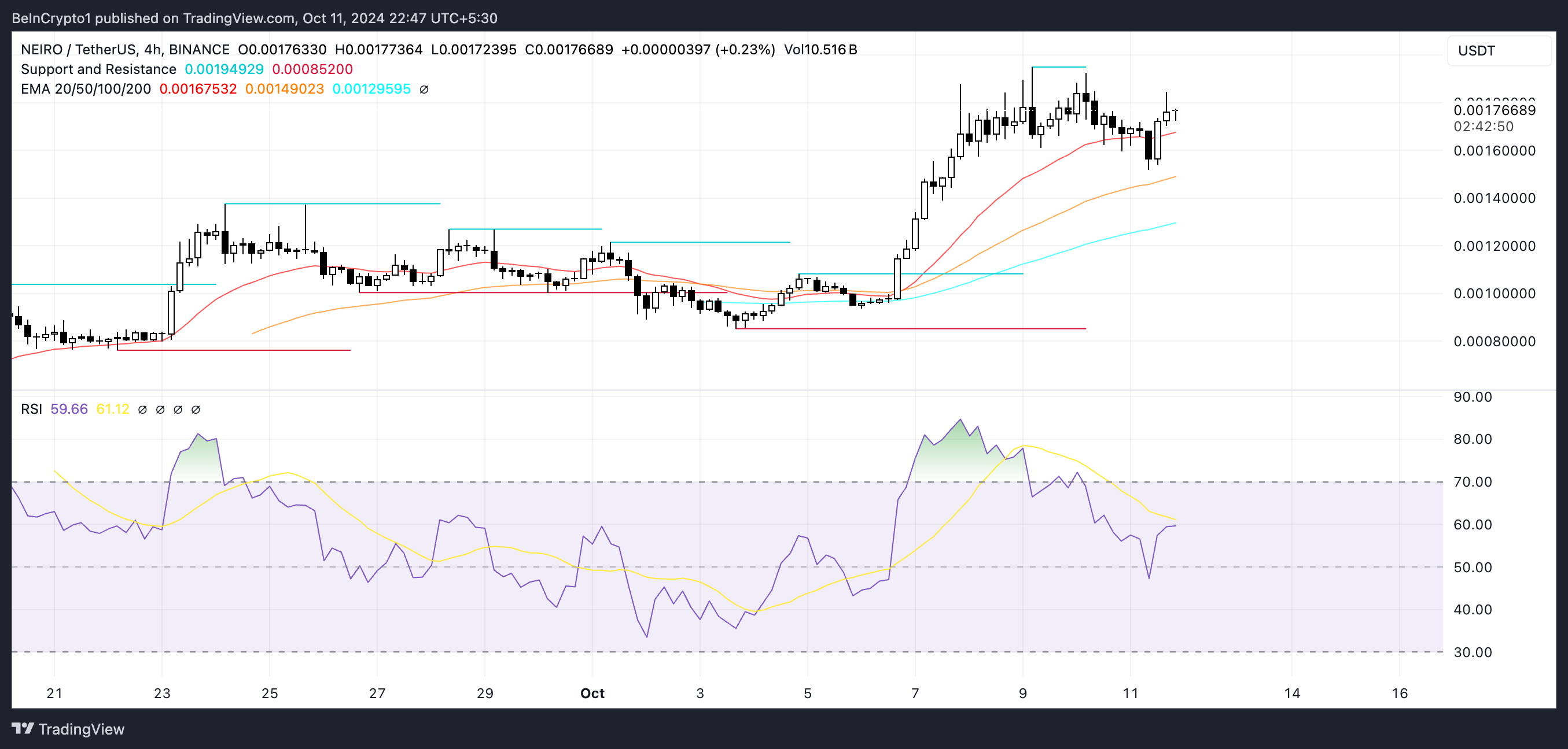 Dengan garis EMA yang menunjukkan kekuatan, ada kepercayaan yang berkembang bahwa NEIRO dapat terus menguat, mungkin menetapkan rekor baru. RSI juga terlihat cukup sehat di 59,55, artinya koin sedang mendapatkan momentum tanpa menjadi overbought.