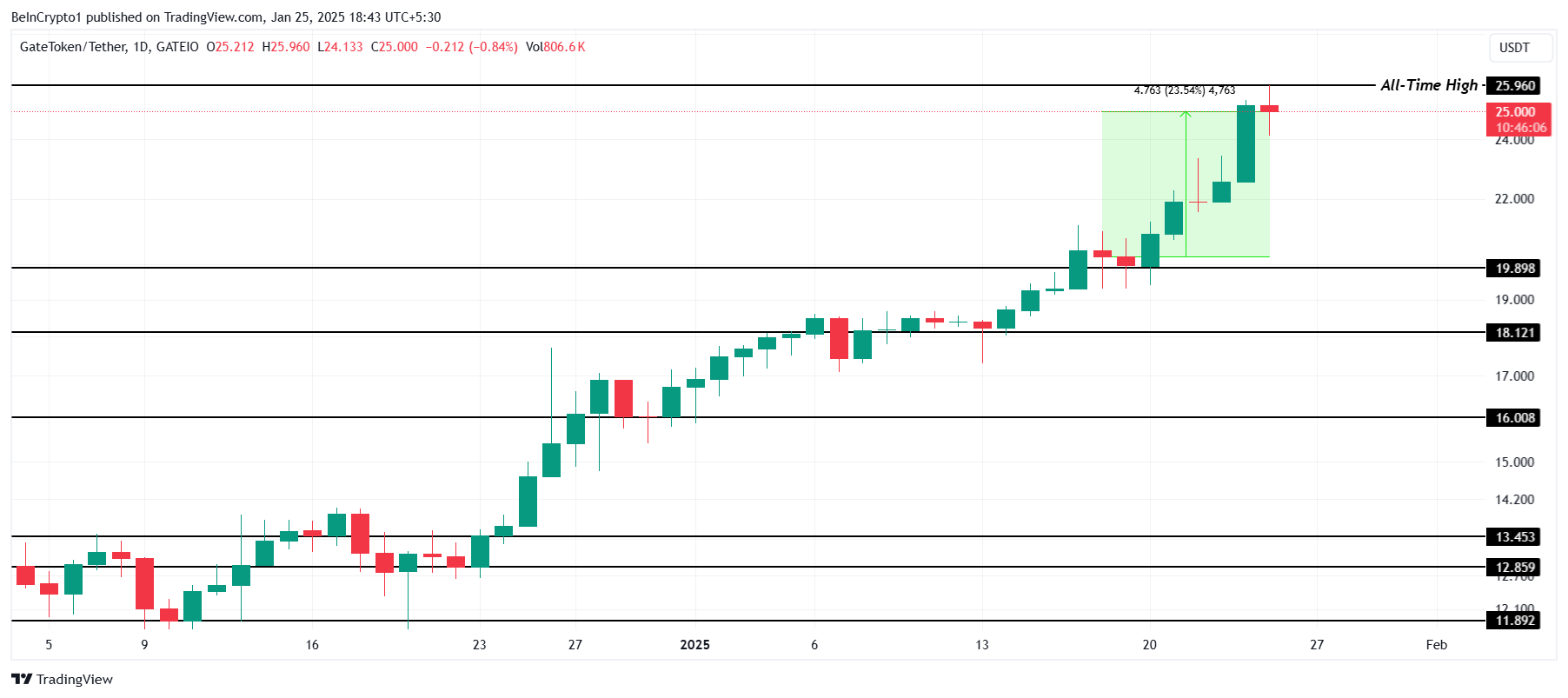 GateToken (GT) mencetak reli 23% pekan ini, mencapai rekor all-time high (ATH) baru di US$25,96 selama sesi perdagangan terbaru. Momentum naik yang konsisten ini telah mencuri perhatian investor, menjadikan altcoin ini salah satu yang berkinerja terbaik di pasar saat ini.
