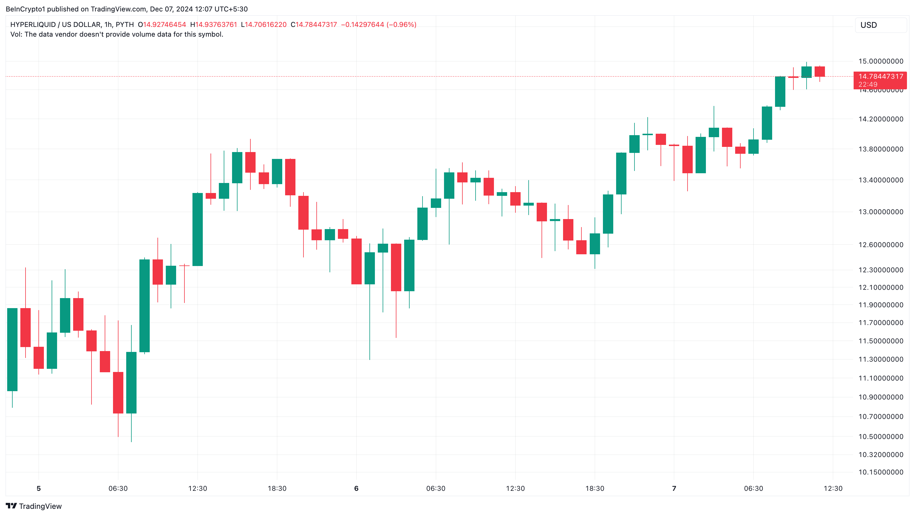 Pada 29 November, Hyperliquid mendistribusikan 310 juta token HYPE kepada komunitasnya. Sejak itu pula, harga altcoin ini menguat dari US$3,90 menjadi US$14,78.