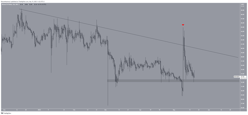 Peristiwa itu mengawali pergerakan turunnya yang sedang berlangsung. Saat ini, harga BSV diperdagangkan di dalam area support horizontal US$32.