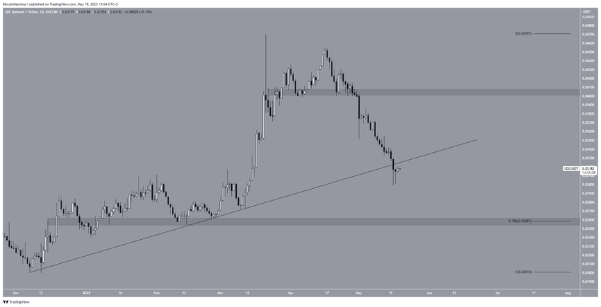Altcoin pertama yang tergabung dalam daftar top loser pekan ini adalah XDC Network (XDC). Harga XDC telah menurun sejak menyentuh titik tertingginya di tahun ini, yaitu US$0,047, pada tanggal 21 Maret lalu. Penurunan tersebut mengakibatkan breakdown dari garis ascending support yang terjadi saat 17 Maret kemarin.