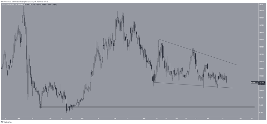Namun, terlepas dari pantulan yang terjadi pada tanggal 9 Mei lalu, harga ATOM gagal memulai pergerakan naik. Sebaliknya, altcoin ini justru berada sangat dekat dengan garis support dari pola wedge tersebut.