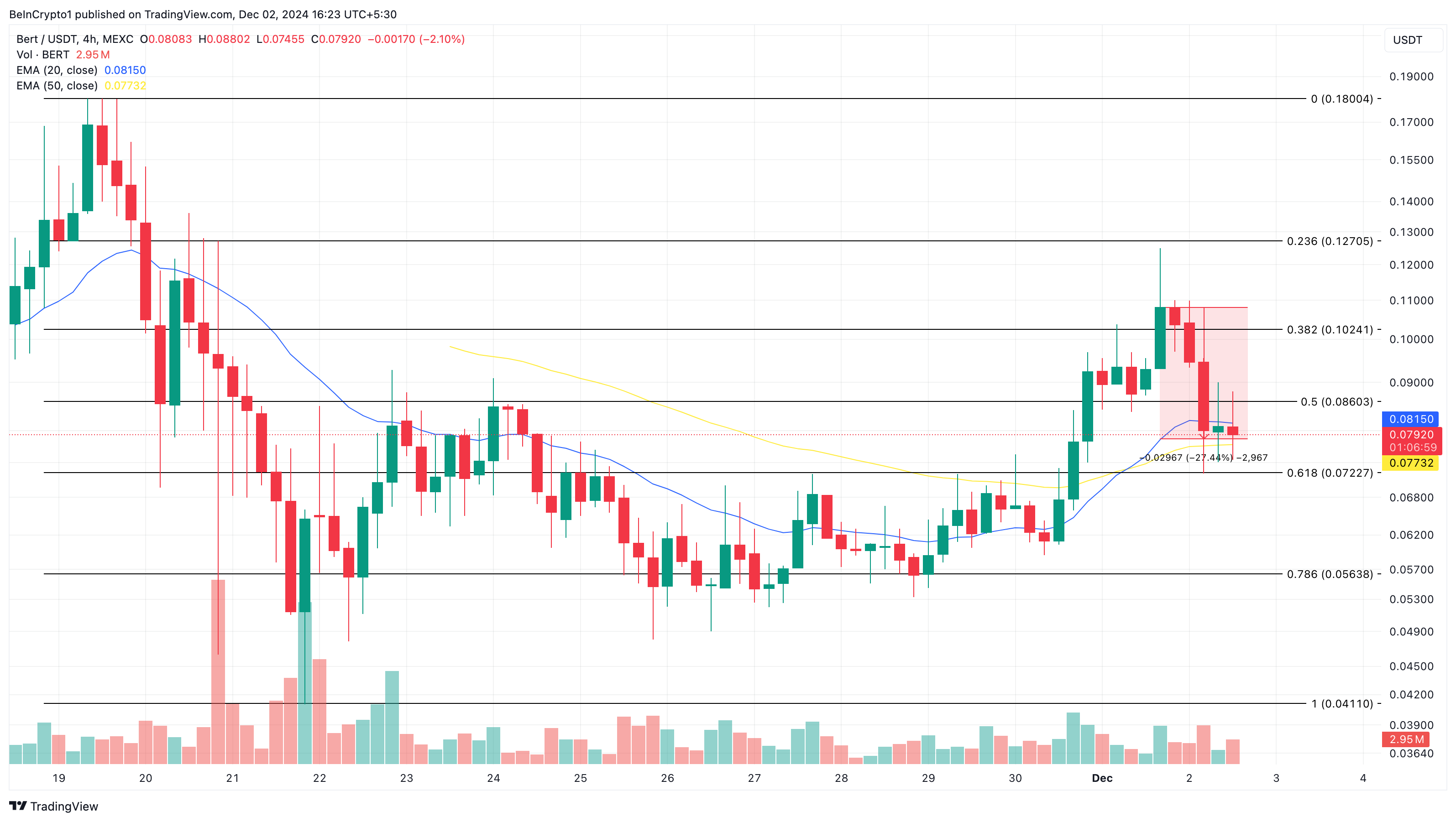 Pada grafik 4 jam, BERT terjatuh ke bawah Exponential Moving Average (EMA) periode 20. Gambar berikut juga menunjukkan bahwa altcoin ini nyaris drop ke bawah EMA 50 (kuning).