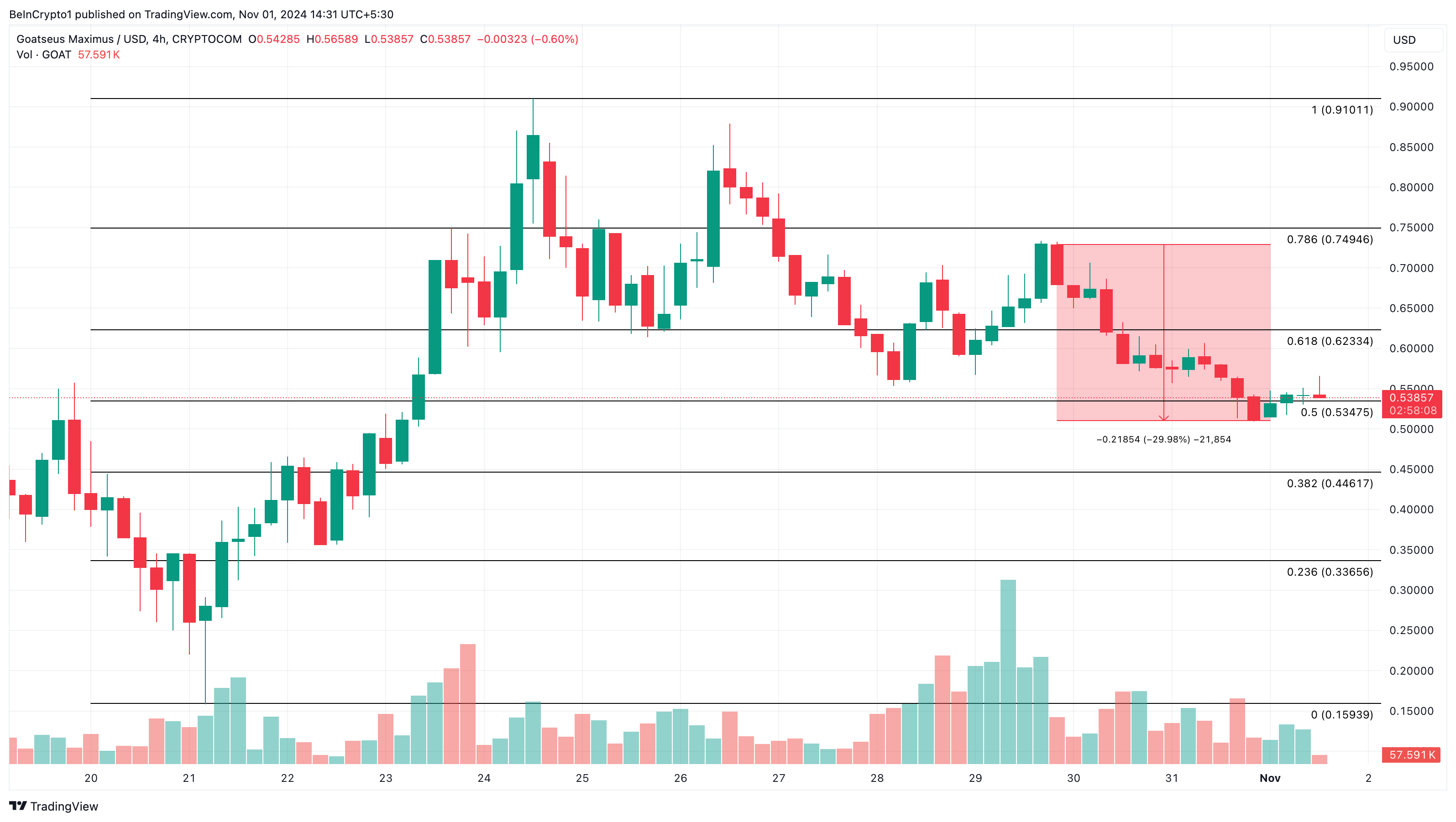Saat ini, harga GOAT adalah US$0,54, atau drop 38% dari rekor all-time high-nya. Namun, grafik 4 jamnya menunjukkan bahwa bull mendukung pemulihan harga; terdapat level support di US$0,50.