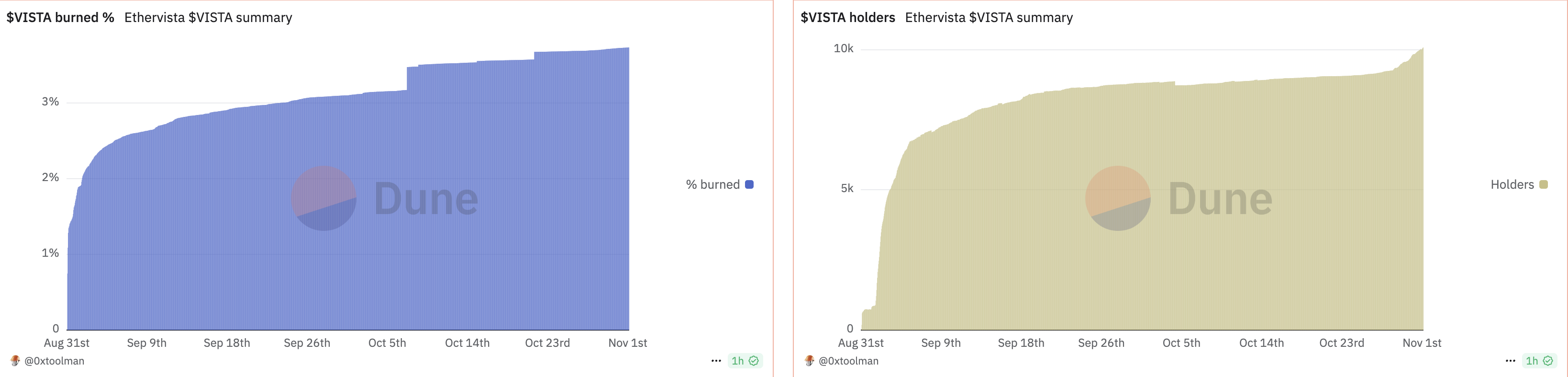 Menurut Dune Analytics, kenaikan ini juga mungkin ada kaitannya dengan ledakan jumlah token yang menjalani burning serta bertambahnya jumlah holder. Di pertengahan Oktober, jumlah holder VISTA masih berada di bawah 8.000.