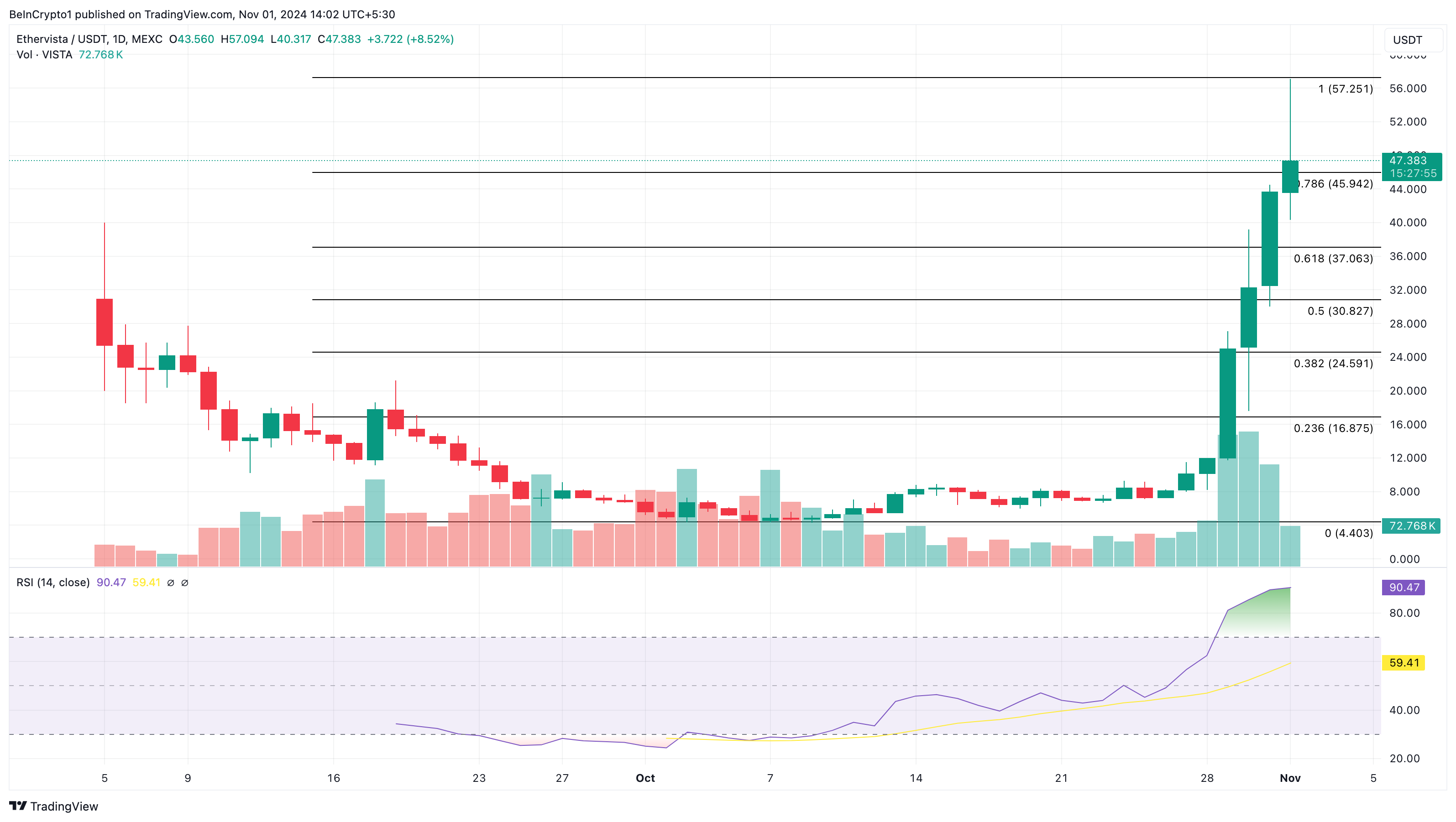 Meskipun begitu, setelan teknikal mengindikasikan bahwa harga VISTA mungkin tidak akan mengalami koreksi lantaran belum ada resistance signifikan di depan. Jika situasi ini bertahan, nilai altcoin ini bisa meroket ke rekor tertinggi wick di US$57,25.
