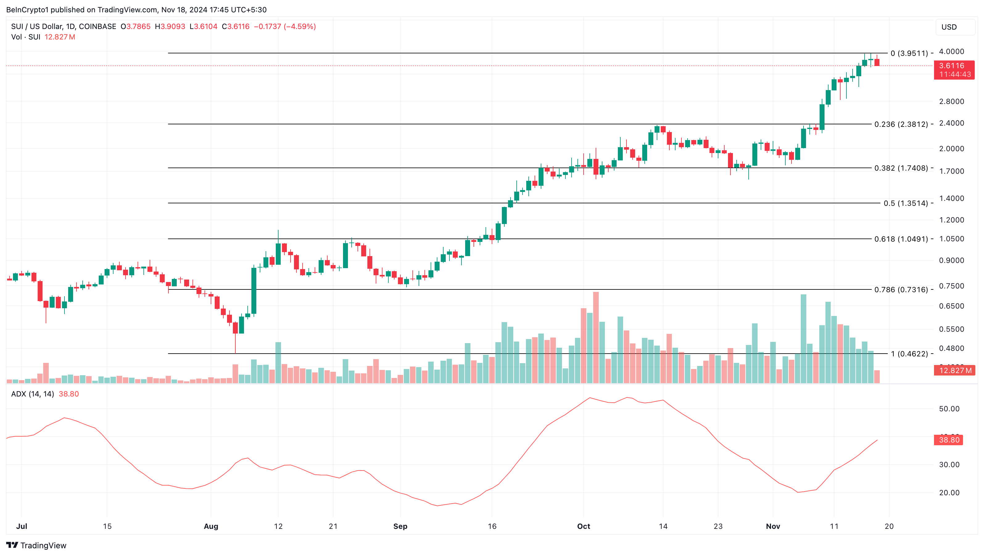Hal ini lantaran meningkatnya nilai ADX , dan karena aksi harga SUI telah cenderung naik untuk beberapa waktu, nilainya pun berpotensi terus menanjak. Jika ini terjadi, harga altcoin dapat melanjutkan tren naik ke atas US$4.