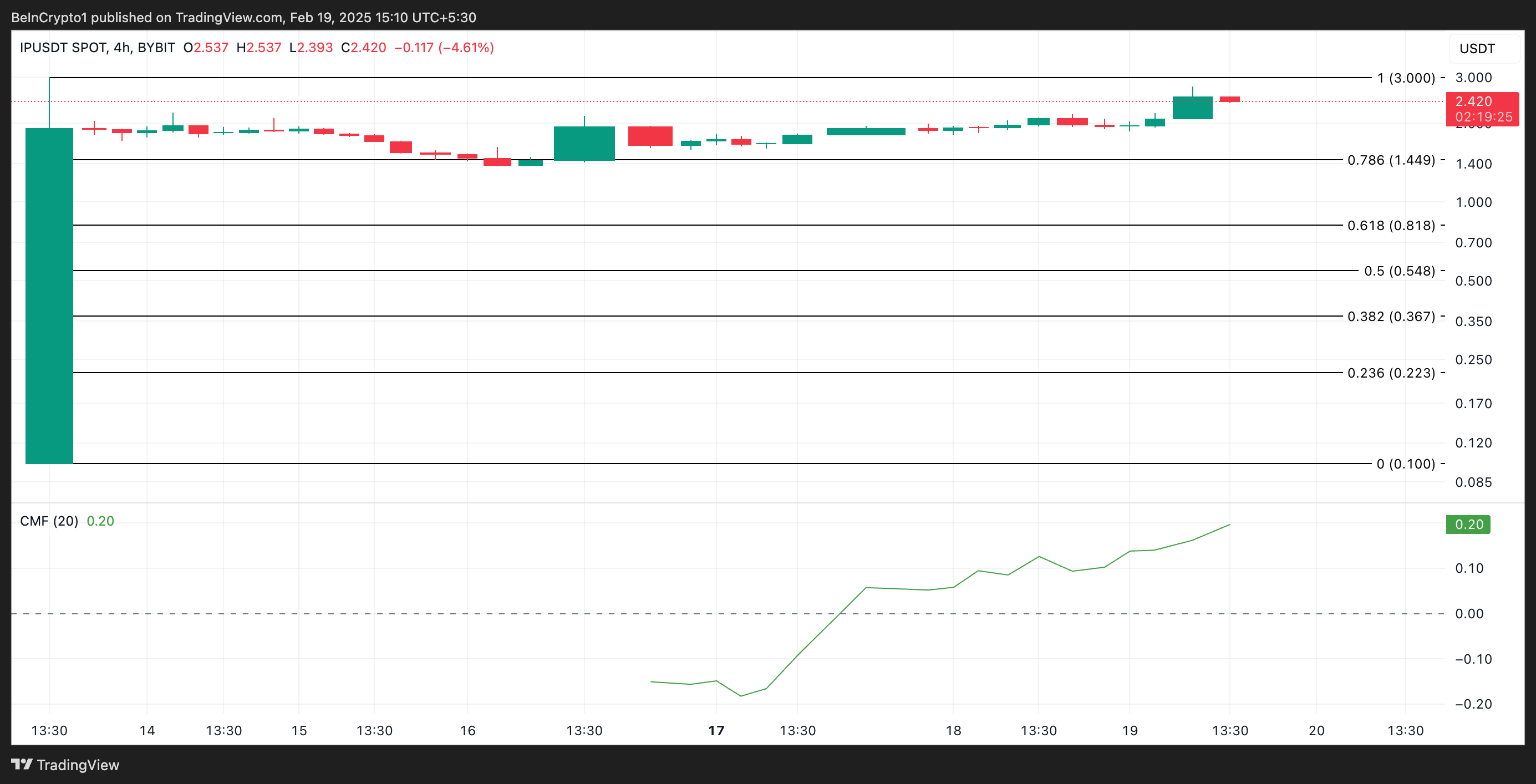 Chaikin Money Flow (CMF) pada grafik empat jam menunjukkan permintaan yang tinggi untuk altcoin ini. Saat ini, CMF berada di angka 0,20, menandakan aliran dana masuk yang kuat seiring dominasi aktivitas beli.
