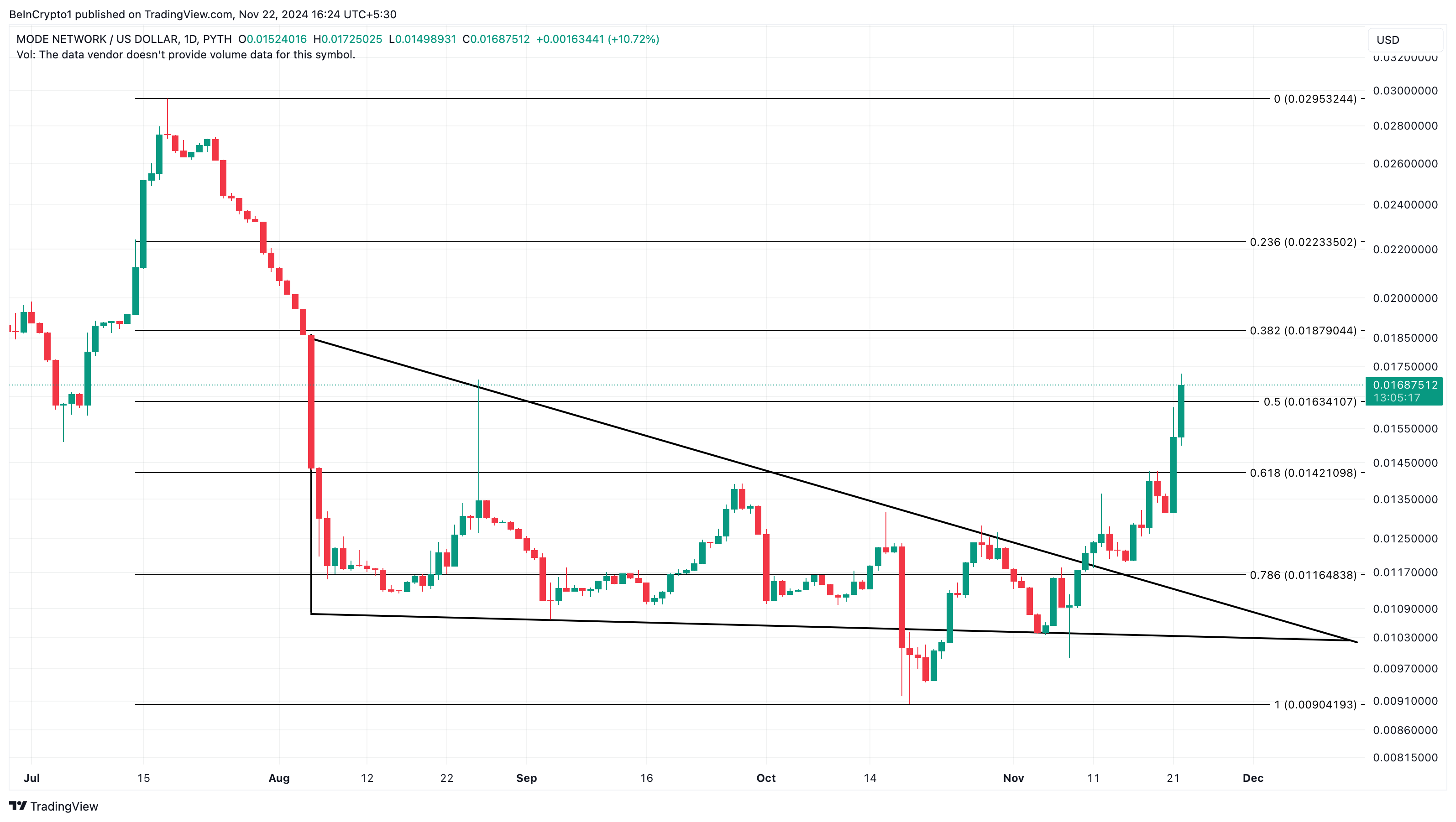 Seperti kemarin, Mode kembali menjadi salah satu altcoin trending hari ini. Berbeda dengan aksi harganya pada 21 November, harga MODE melesat 26,50% dalam 24 jam terakhir.