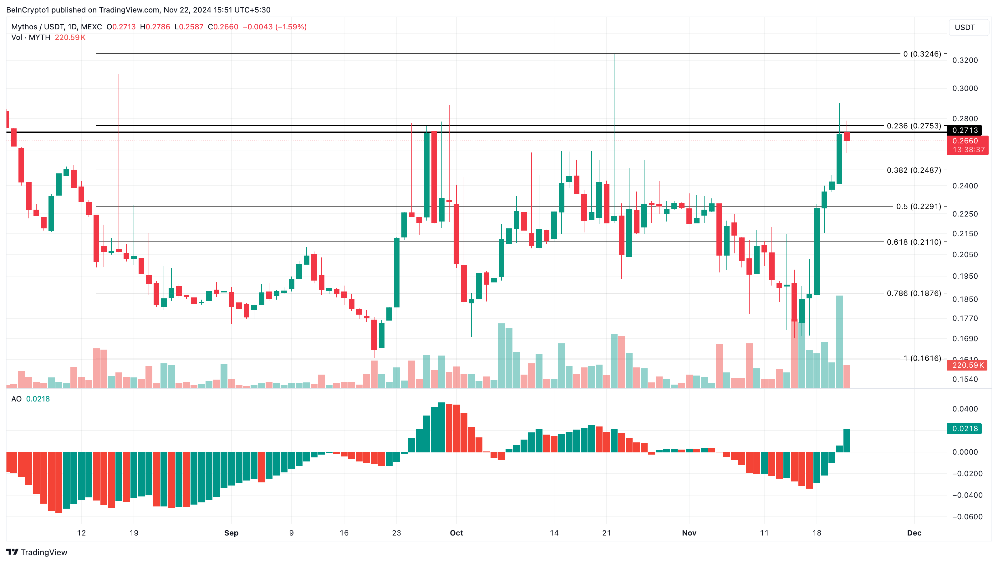 Saat publikasi, harga MYTH bertengger di angka US$0,27 namun menghadapi resistance di area yang sama. Meski begitu, indikator Awesome Oscillator (AO) yang membantu mengukur momentum menunjukkan bahwa sentimen atas altcoin ini masih bullish.
