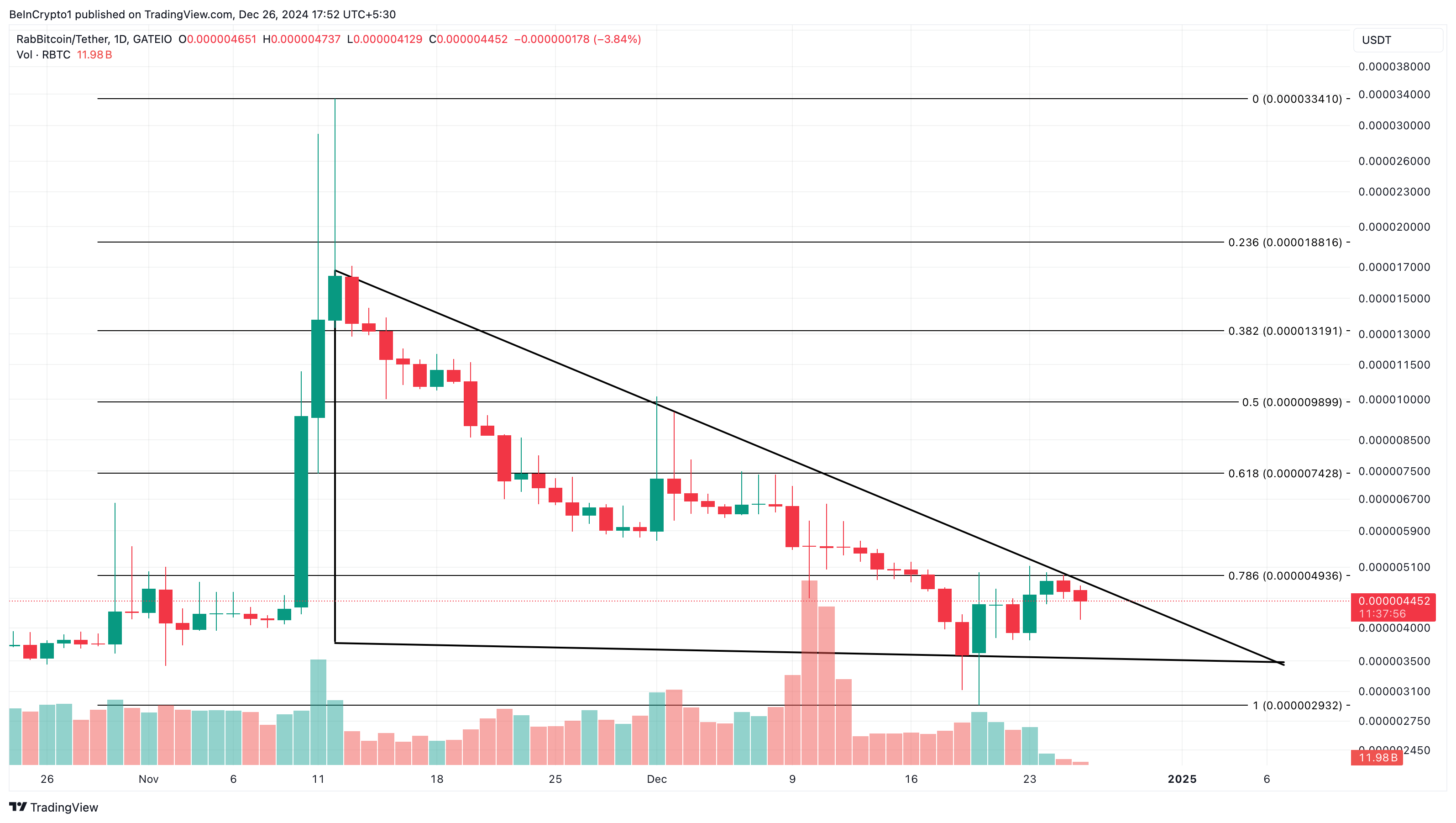 Berbeda dengan dua altcoin trending lainnya, RabBitcoin adalah satu-satunya yang mengalami koreksi harga dalam 24 jam terakhir. Selama periode ini, harga RBTC terkikis sebesar 7,50% akibat terjangan aksi jual yang meliputi altcoin ini.