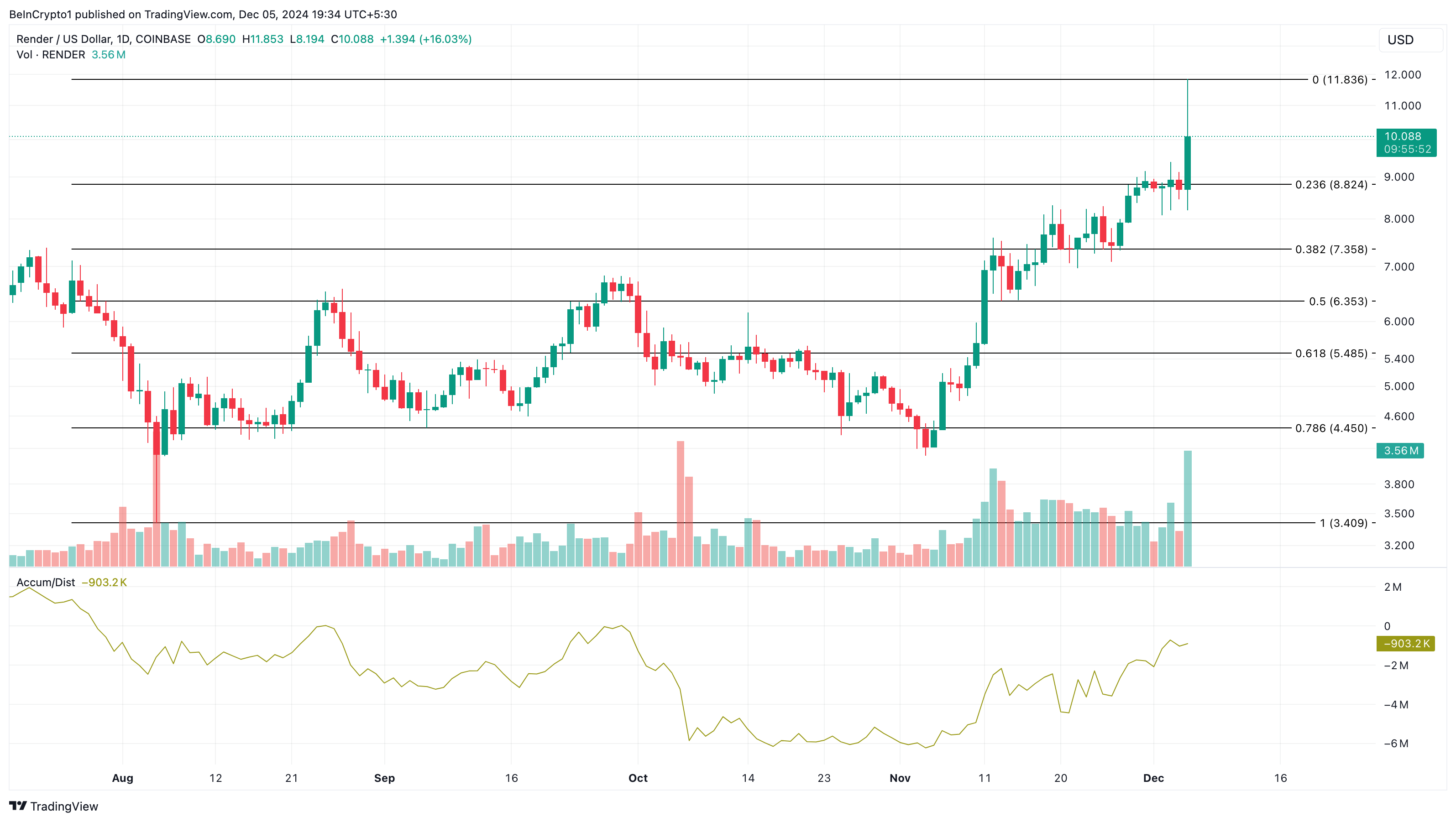 Seperti halnya Hyperliquid, RENDER juga trending berkat kinerjanya. Dalam 24 jam terakhir, harga RENDER sudah naik 15% dan kini bertengger di atas US$10. Hal ini menjadikannya salah satu altcoin bertema AI dengan performa terbaik kemarin.