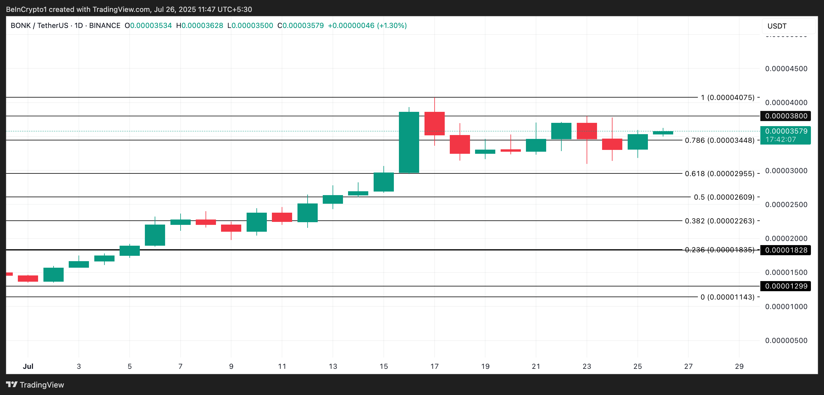 Meme coin ini diperdagangkan pada US$0,00003 saat artikel ini ditulis, naik 7% dalam 24 jam terakhir. BONK bisa memperpanjang reli menuju US$0,000038 jika tekanan beli berlanjut. Jika berhasil menembus resistance tersebut, altcoin ini bisa kembali mencapai puncak tahunannya di US$0,000040.