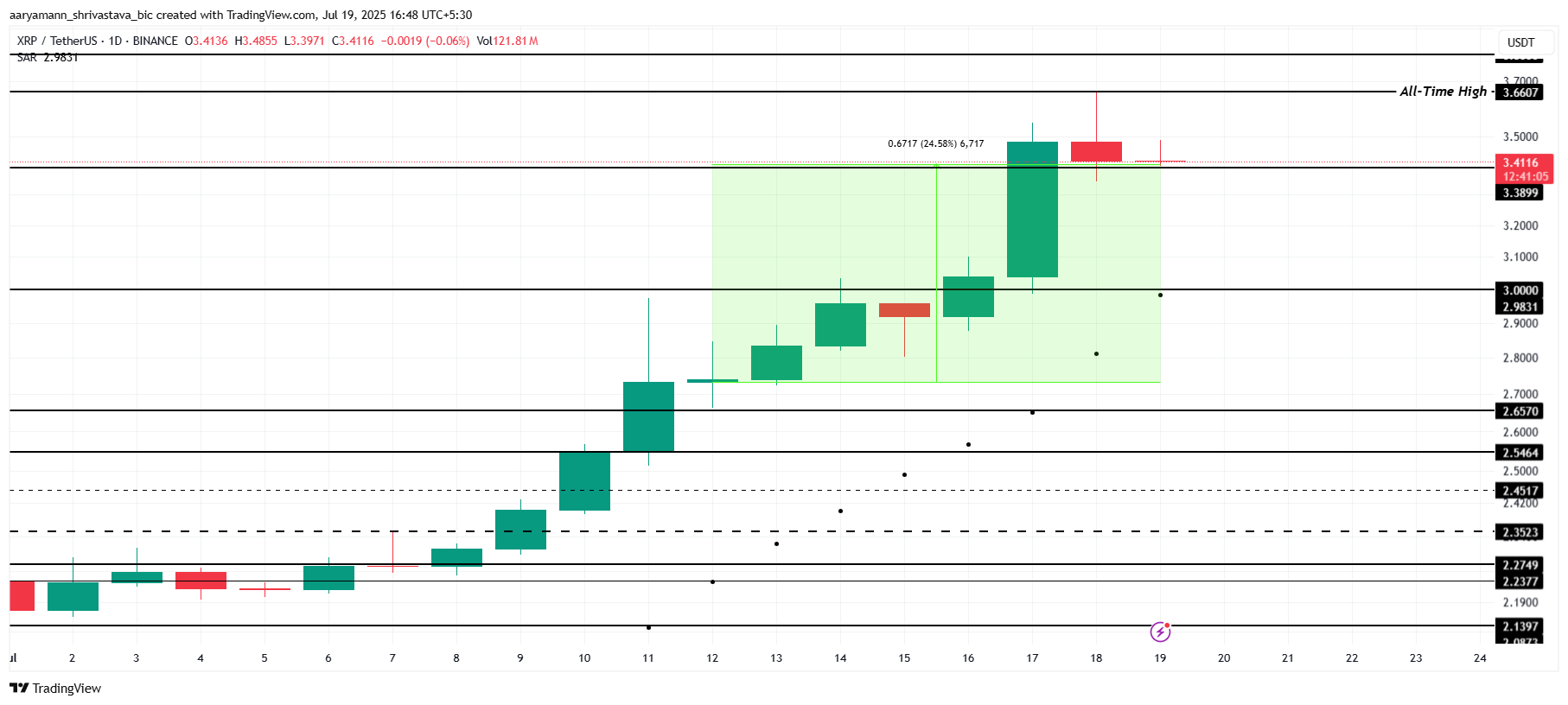 XRP saat ini bertahan di atas level support US$3.38. Meskipun harga mulai mendingin, Parabolic SAR masih berada di bawah candlestick, menandakan bahwa tren naik tetap utuh.