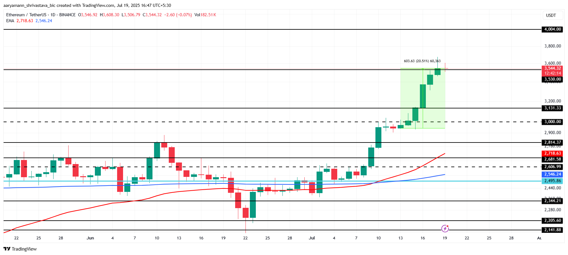 Harga Ethereum melonjak 20,51% selama seminggu terakhir, mencapai US$3.544 dan menandai level tertinggi dalam 6 bulan. Reli ini menguat setelah ETH membentuk Golden Cross minggu lalu.
