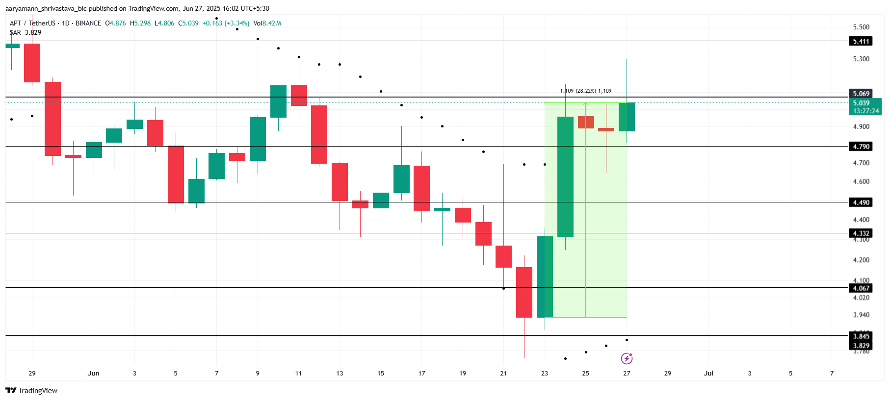 Harga APT sudah menguat 28% pekan ini, bertahan kokoh di atas US$5,00 pada waktu publikasi. Altcoin ini kini menghadapi resistance di US$5,06 yang menjadi rintangan penting. Menembus level ini sangat krusial agar APT dapat menjaga momentumnya dan terus mendaki.