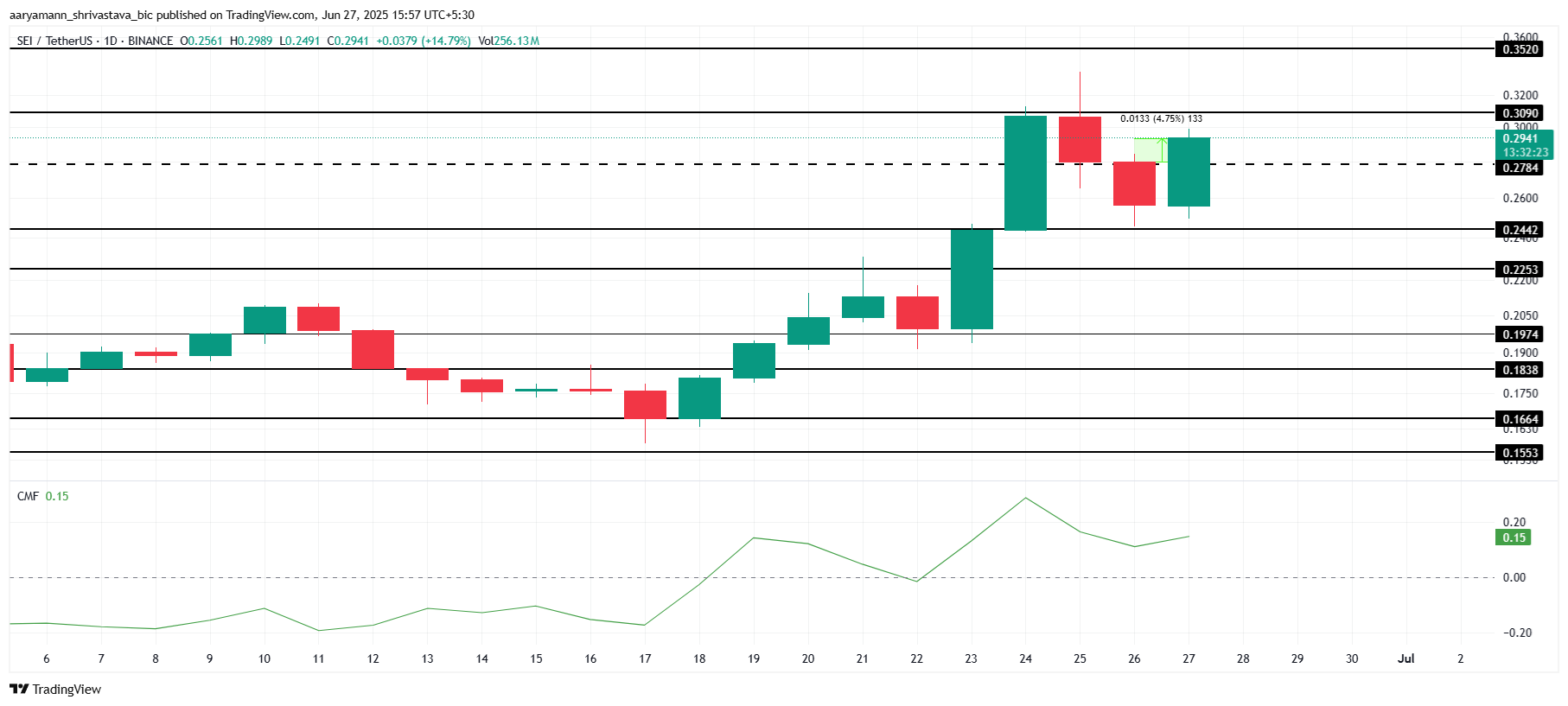 Indikator Chaikin Money Flow (CMF) memperlihatkan arus masuk bersih yang solid ke SEI, terdorong momentum bullish terbaru. Ini menegaskan bahwa minat atas altcoin ini semakin meningkat, mendukung peluangnya melewati US$0,30. Dengan minat beli yang solid, SEI bisa terus merangkak naik, berpotensi mencapai US$0,35 bila momentumnya terjaga.