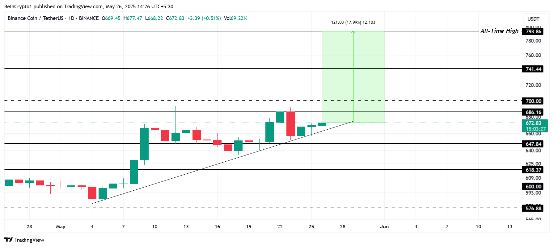 Hard fork Maxwell bisa menjadi katalis penting bagi ledakan aktivitas jaringan. Saat ini, BNB diperdagangkan di kisaran US$672 dan menghadapi dua resistance utama: US$686 dan US$700. Seumpama pasar merespons upgrade ini dengan semangat, maka jarak 18% menuju all-time high (ATH) di US$793 bisa segera ditutup.