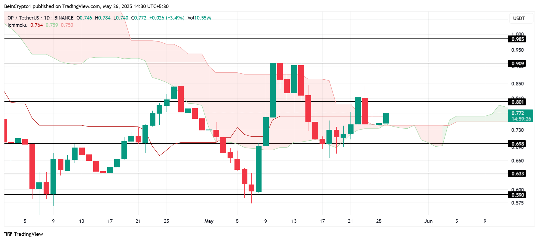 Saat ini, OP diperdagangkan di atas Ichimoku Cloud, menandakan kekuatan bullish yang potensial. Formasi teknikal ini membuka kemungkinan bagi OP untuk menembus resistance di US$0,80 dan terus merangkak naik ke kisaran US$0,90, menarik perhatian lebih banyak investor.