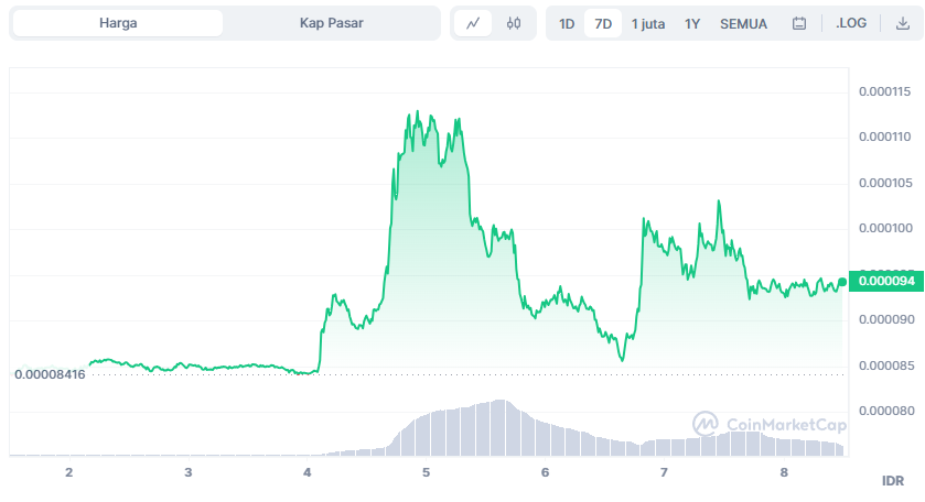 Harga aset digital saat ini berada di bawah simple moving average (SMA) 50 hari sebesar $0,00011 untuk jangka pendek dan SMA 200 hari sebesar US$0,00016 untuk jangka panjang.