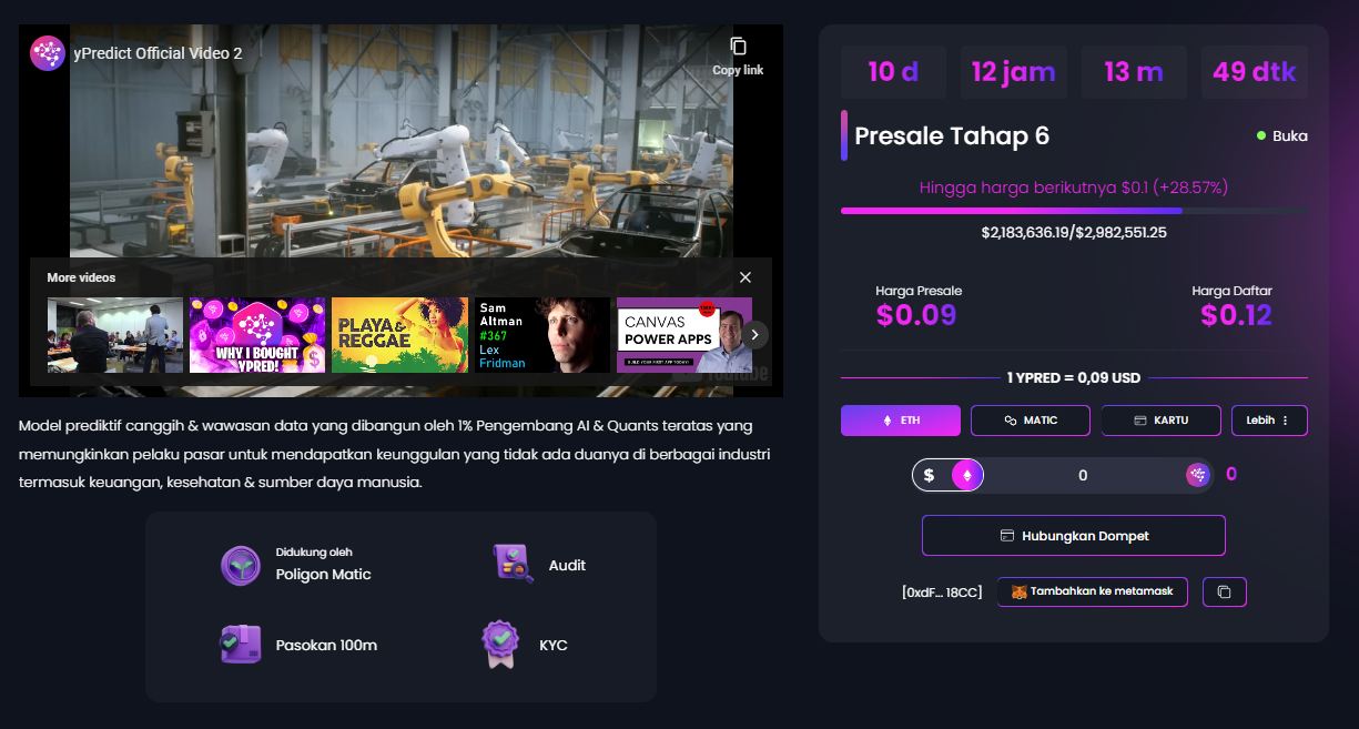 Pada saat berita ini ditulis, token $YPRED tersedia untuk dibeli dengan harga US$0,09 per token. Namun, harganya akan meningkat 33,3% setelah proyek ini mencapai nilai tahap presale akhir sebesar US$0,12.