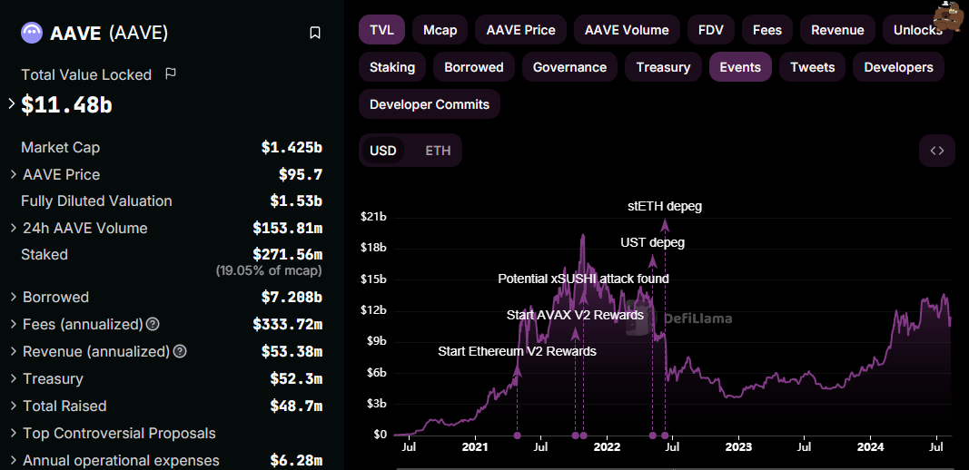 Di luar prospek teknikal yang bernada bullish, metrik on-chain untuk AAVE juga menyokong prospek positif. Blockchain Aave kini memiliki total value locked (TVL) sekitar US$11,5 miliar; kapitalisasi pasarnya US$1,4 miliar lebih. Menurut van de Poppe, valuasi ini mencerminkan adanya potensi kenaikan yang substansial.