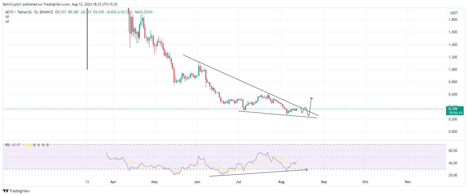 van de Poppe selanjutnya mengidentifikasi pola falling wedge pada grafik harian AEVO, yang menunjukkan potensi breakout ke arah atas. Pola ini dianggap sebagai sinyal bullish reversal, yang dikonfirmasi ketika harga menembus garis tren atas. Target profit untuk pola ini biasanya dihitung dengan menambahkan jarak maksimum antara garis tren atas dan bawah ke titik breakout.