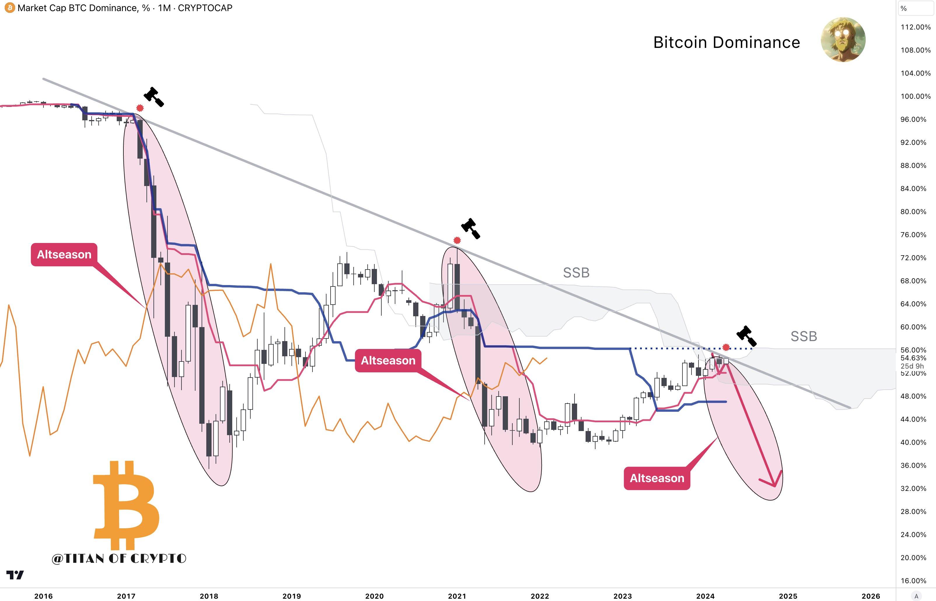 “Saya pribadi yakin akan ada altseason lagi. Dan seperti pada tahun 2021, SSB (Senkou Span B), garis terkuat Ichimoku, akan memainkan peran besar dalam memblokir Bitcoin dominance sekaligus memulai Altseason2024,” ujar Titan of Crypto.