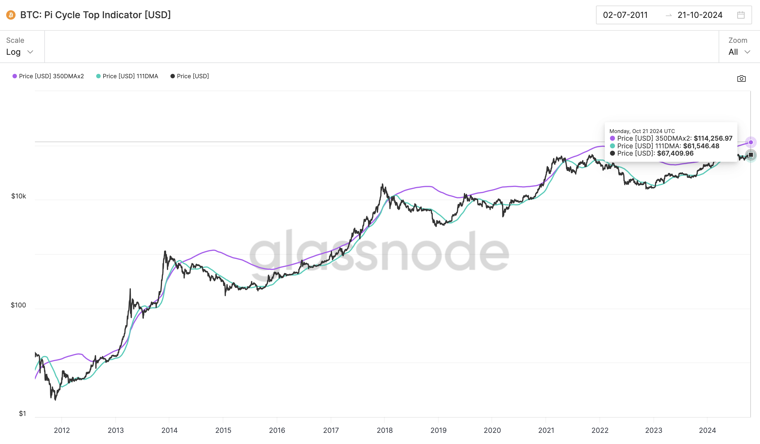 Hanya saja, data on-chain dari indikator puncak siklus (Cycle Top) Bitcoin mengatakan bahwa harga puncak BTC mungkin tidak akan mencapai level setinggi itu. Alasannya, Simple Moving Average (SMA) 350 hari, yang mendeteksi harga tertinggi siklus, mengungkap bahwa puncak BTC mungkin hanya akan berkitar di US$114.256.