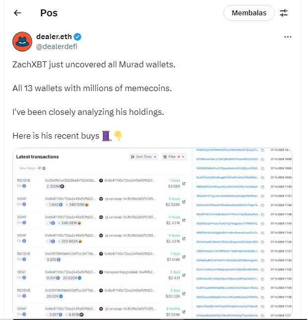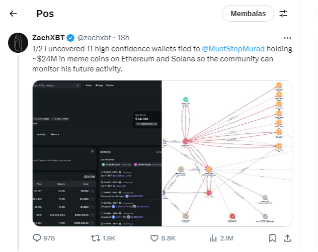 “Saya menemukan 11 wallet yang terkait dengan Murad Mahmudov. Wallet tersebut memegang sekitar US$24 juta dalam meme coin di jaringan Ethereum (ETH) dan Solana (SOL). Komunitas bisa memantau aktivitasnya di masa mendatang. Orang-orang berhak membuat keputusan yang lebih tepat untuk setiap token yang mereka beli,” jelas ZachXBT.