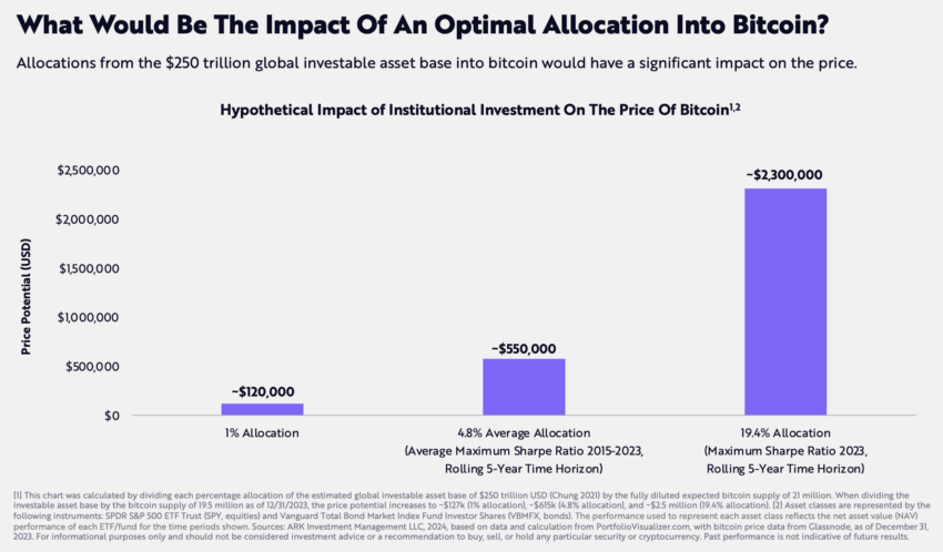 Laporan ARK mendukung pelibatan Bitcoin ke dalam portofolio yang terdiversifikasi, merujuk pada potensinya untuk meningkatkan keuntungan yang disesuaikan dengan risiko. Mereka menyatakan bahwa bahkan realokasi kecil dari aset global dapat mendongkrak nilai Bitcoin secara signifikan. Adanya pergeseran sebesar 1% saja dapat mengerek harga Bitcoin menjadi US$120.000, sementara realokasi sebesar 4,8% dapat membuat nilainya melonjak menjadi US$550.000.
