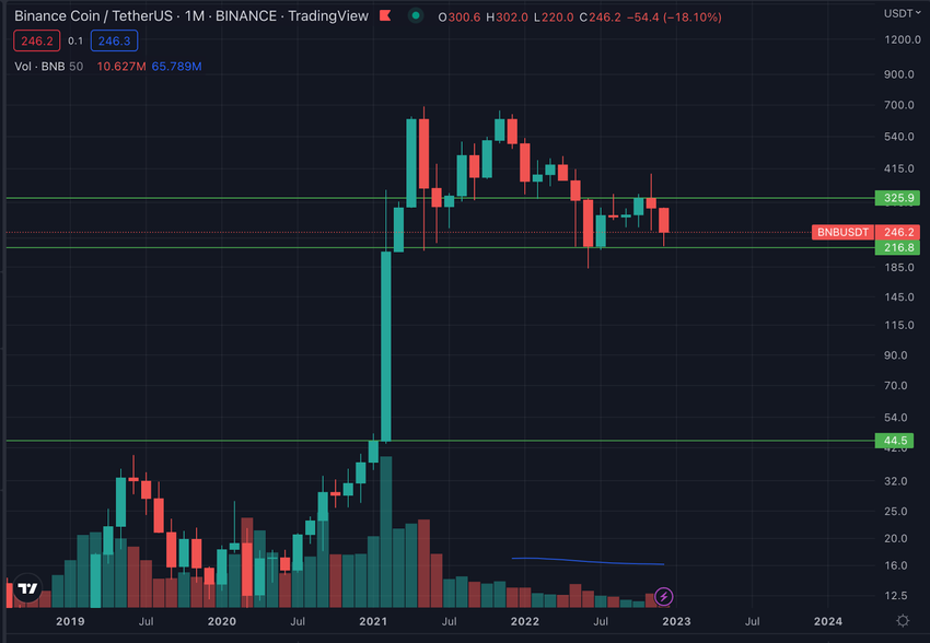 Akun Twitter PROFIT BLUE mengklaim bahwa BNB tengah membentuk pola reversal yang sama dengan pola yang membuat harga Bitcoin (BTC) anjlok dari level US$69.000 menjadi US$15.000. Bitcoin sendiri membentuk pola double-top serupa pada jangka waktu bulanan dengan neckline di US$35.000. Setelah melewati neckline tersebut, harga Bitcoin terjun payung lebih dari 50%, dan saat ini diperdagangkan dengan harga sekitar US$16.600.