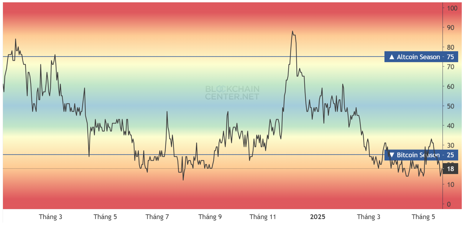 Namun, tak semua sinyal terlihat menggembirakan. Menurut Blockchain Center, Altcoin Season Index sempat amblas ke titik terendah tahun ini, yakni 13, tepat saat Bitcoin mencetak rekor ATH anyar. Kini, indeks itu naik tipis ke angka 18 pada waktu publikasi.