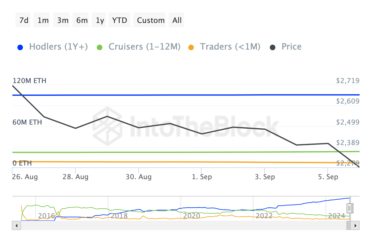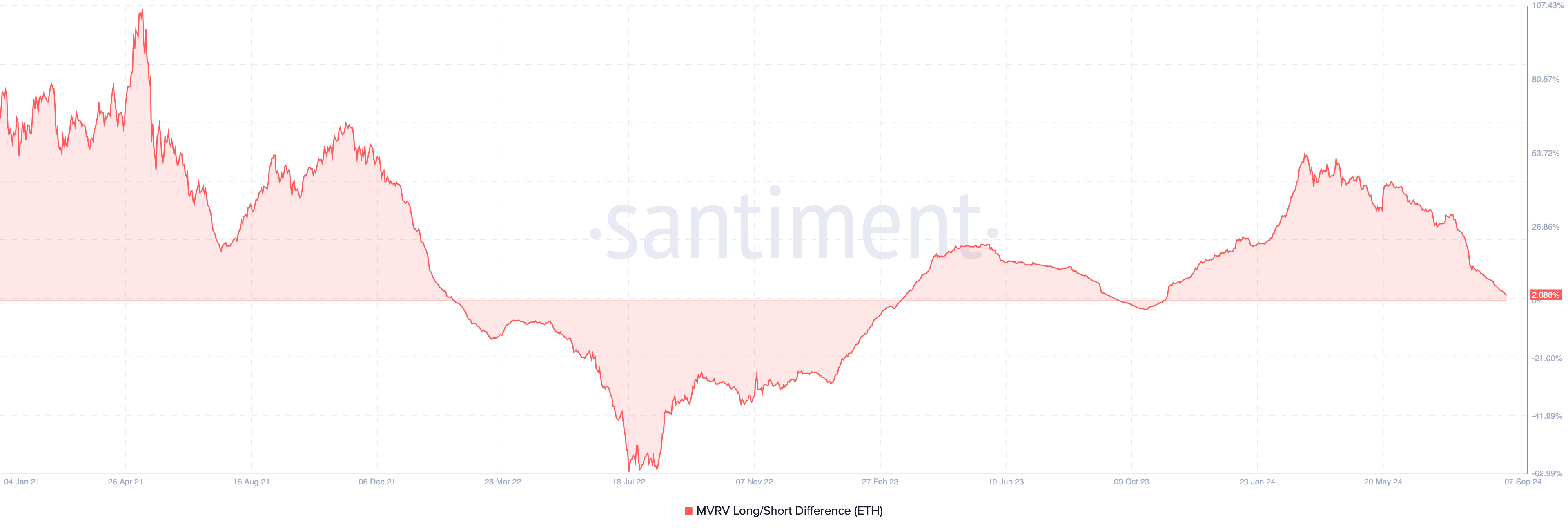Saat perbedaan MVRV Long/Short meningkat, holder jangka panjang menikmati profit yang lebih besar. Sebaliknya, penurunan ke zona negatif mengindikasikan kondisi sebaliknya. Saat ini, indikator ini menunjukkan angka 2,08%, yang berarti banyak holder ETH jangka panjang telah keluar dari zona profit.