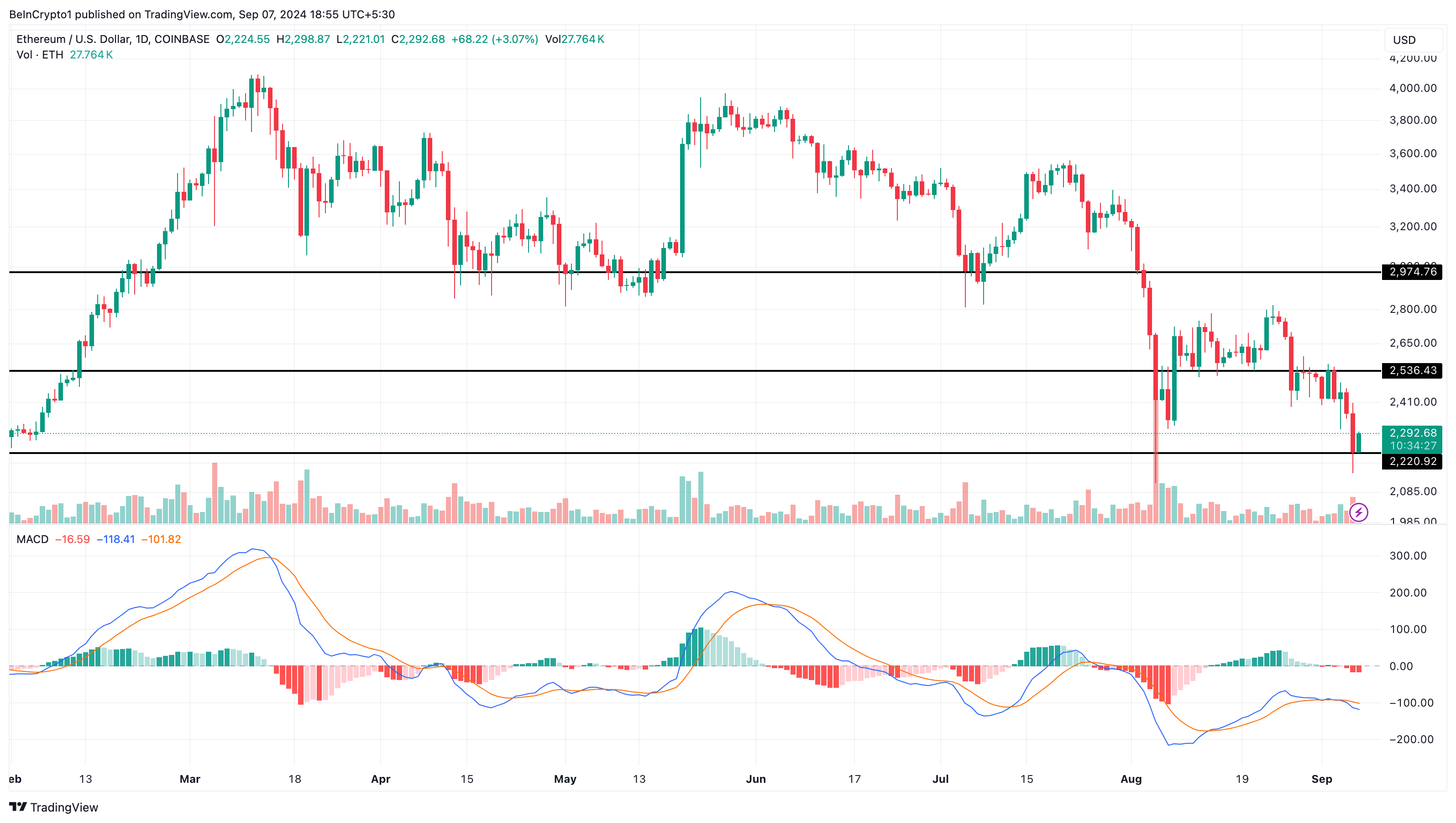 Adapun nilai MACD yang positif mengindikasikan momentum bullish. Sedangkan nilai yang negatif menunjukkan tekanan turun bagi harga. Dari data yang tersaji, harga ETH perlu bertahan di atas US$2.220 untuk kuasa menghindari jatuh ke level yang lebih rendah.