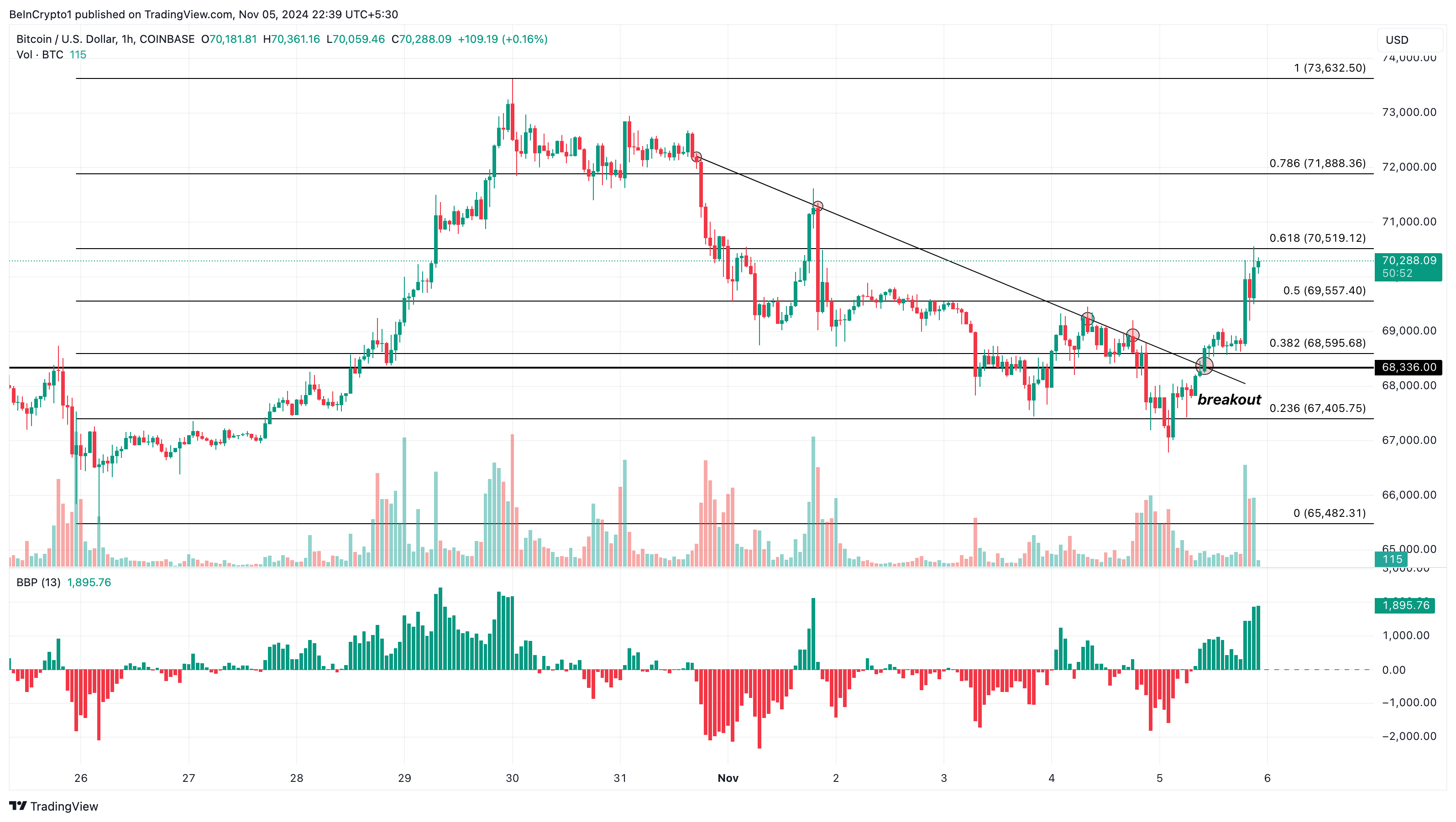 Pada grafik 1 jam, Bitcoin telah mencoba breakout pada empat kesempatan berbeda. Namun, setiap kali itu terjadi sejak 31 Oktober, koin menghadapi penolakan. Namun, hari ini, tren telah berubah karena banteng mendorong aset kripto di atas US$68.336.