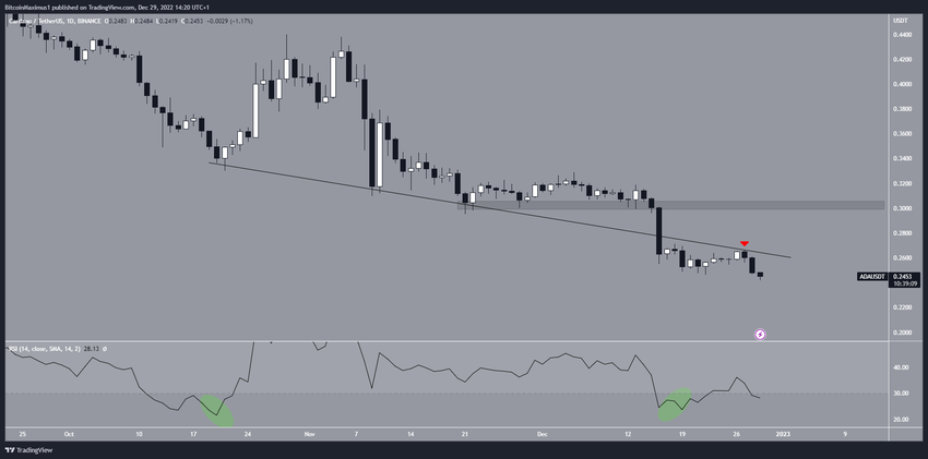 Sejak berhasil menembus area tersebut, harga ADA secara bertahap turun dan sekarang harganya bergerak melintasi area US$0,259. Namun, area support terdekat berikutnya adalah US$0,150, dan angka ini mencerminkan penurunan sebesar 38% dari harganya saat ini.