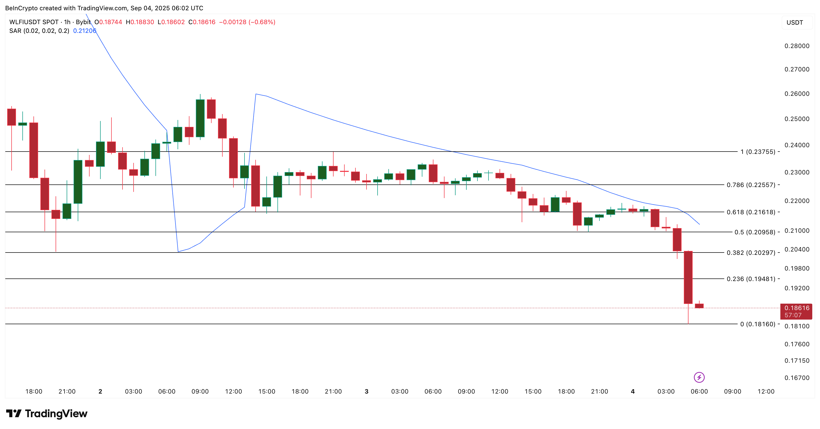 Teknikal juga sama suramnya. Parabolic SAR (Stop and Reverse), indikator tren yang mengikuti dan berbalik di atas atau di bawah harga WLFI untuk menandakan arah, tetap berada di atas candle sejak 2 September.