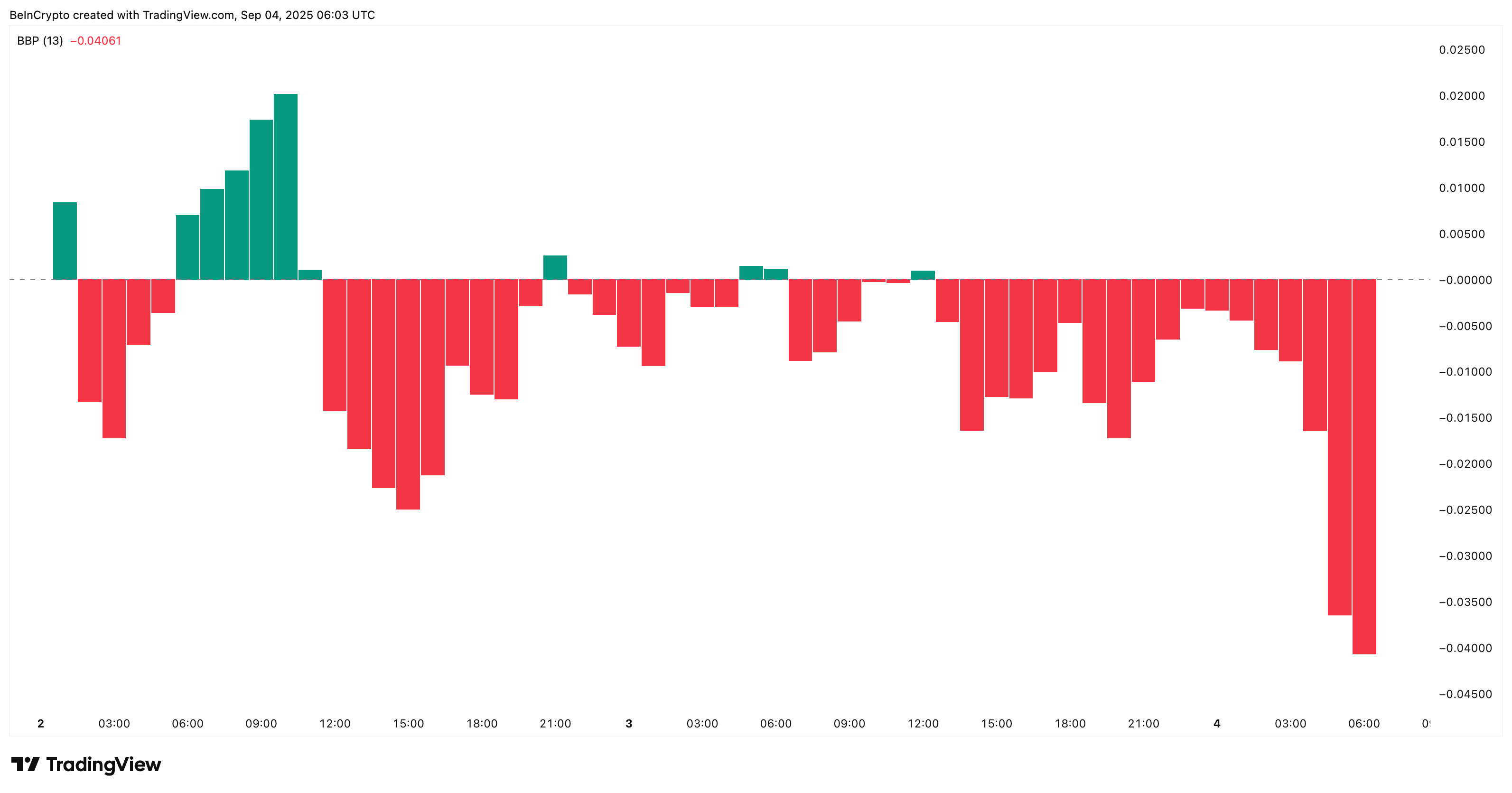 Indikator Bull–Bear Power (BBP) mengonfirmasi ketidakseimbangan ini. BBP membandingkan ekstrem harga dengan moving average untuk menyoroti apakah bull atau bear yang mengendalikan momentum. Pada grafik 1 jam — kerangka waktu yang paling relevan mengingat sejarah perdagangan WLFI yang terbatas — histogramnya berwarna merah tua. Secara sederhana, bear mendikte tren, dan pembeli belum melakukan pertahanan yang berkelanjutan.