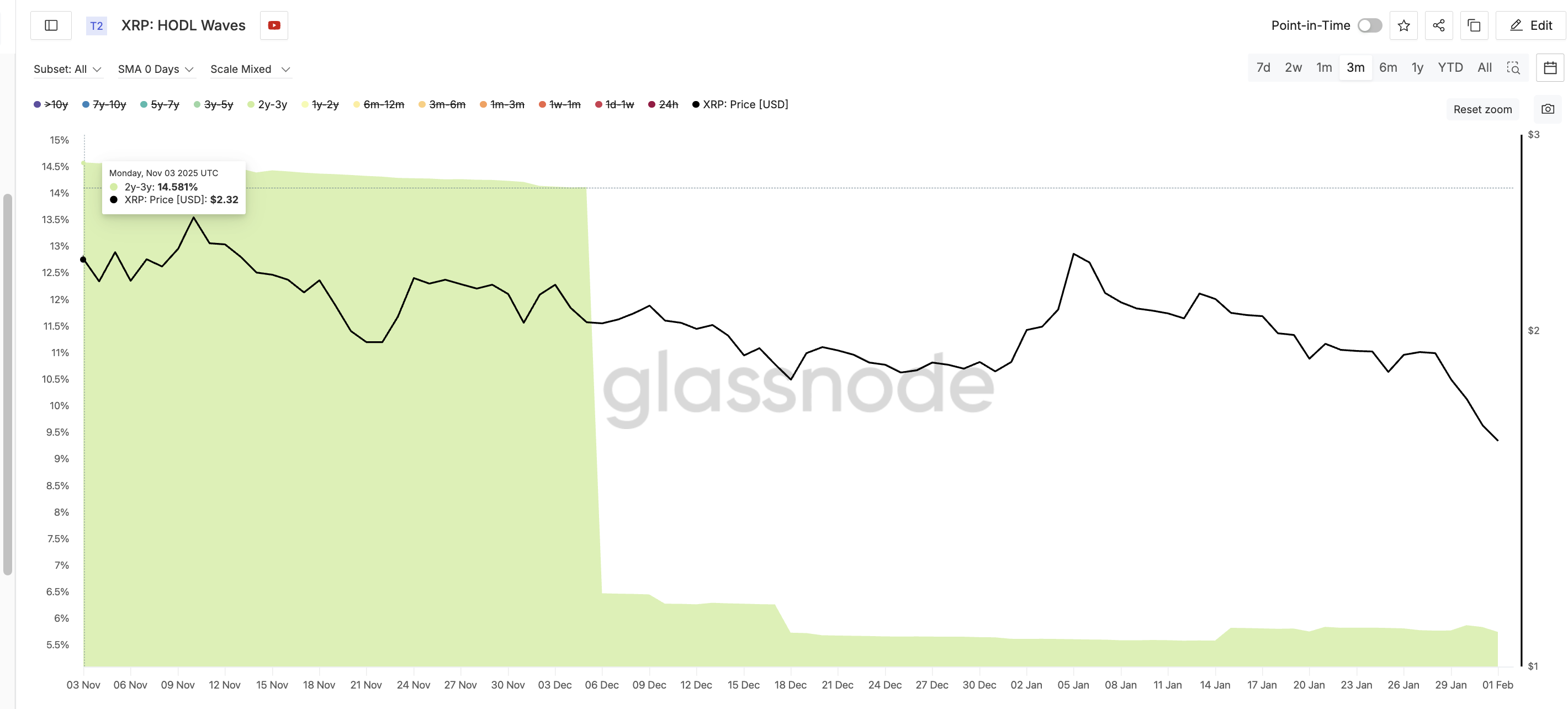 HODL Waves memperlihatkan kelompok yang berinvestasi lebih lama, terutama holder 2 tahun sampai 3 tahun, belum kembali masuk. Kelompok ini pernah memegang lebih dari 14% suplai XRP di akhir 2025. Saat ini angkanya turun menjadi sekitar 5,7% dan cenderung datar. Tidak ada aksi beli meski harga sempat turun drastis.