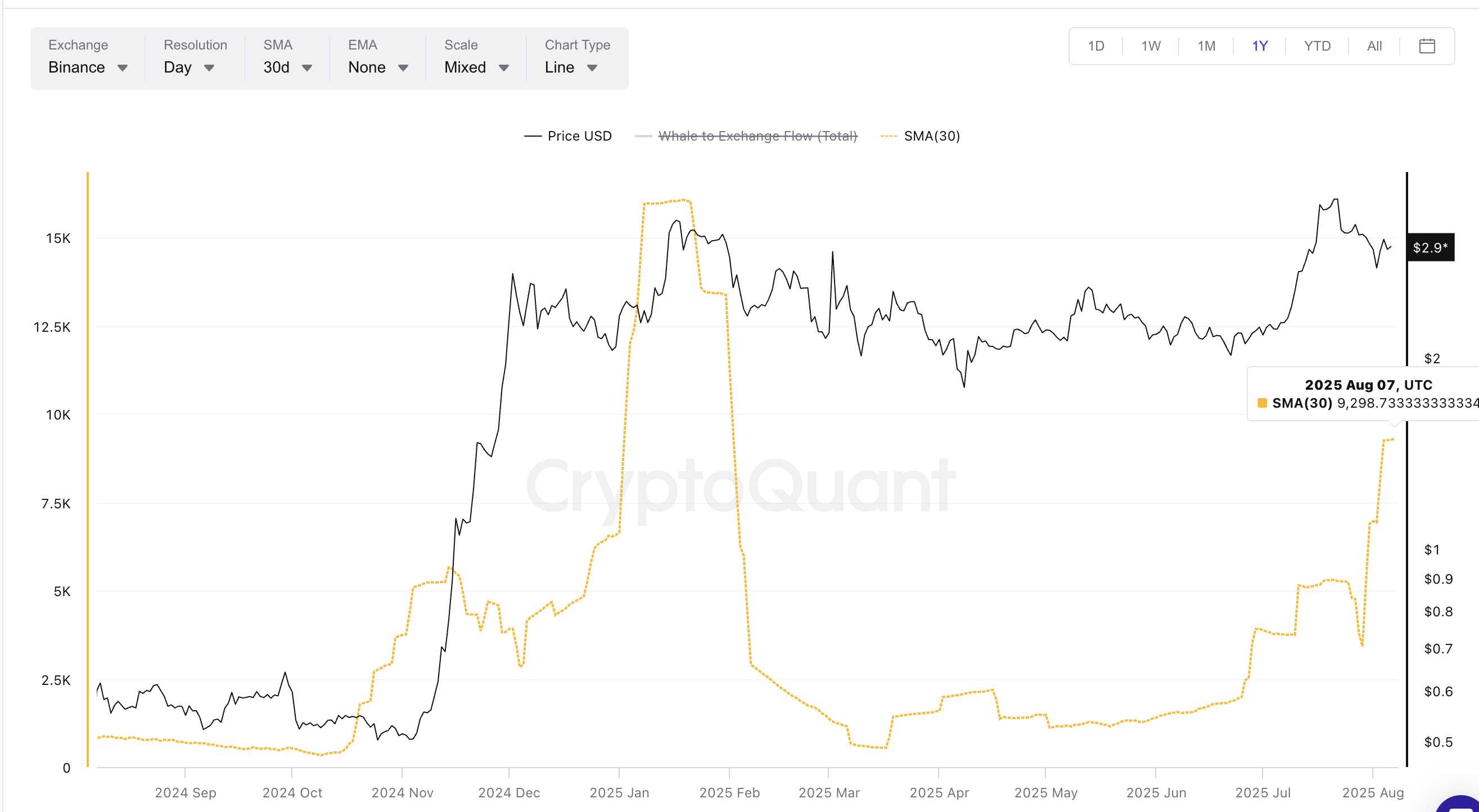 Salah satu tanda paling jelas dari perilaku whale adalah seberapa banyak XRP yang dikirim ke exchange. Pada 7 Agustus, Simple Moving Average (SMA) 30 hari dari arus whale-ke-exchange melonjak ke 9.298, menurut CryptoQuant. Itu adalah lonjakan tertinggi kedua tahun ini, hanya di belakang 18 Januari, ketika metrik yang sama mencapai puncaknya dan XRP anjlok dari US$3,27 ke US$1,70 selama empat bulan berikutnya.