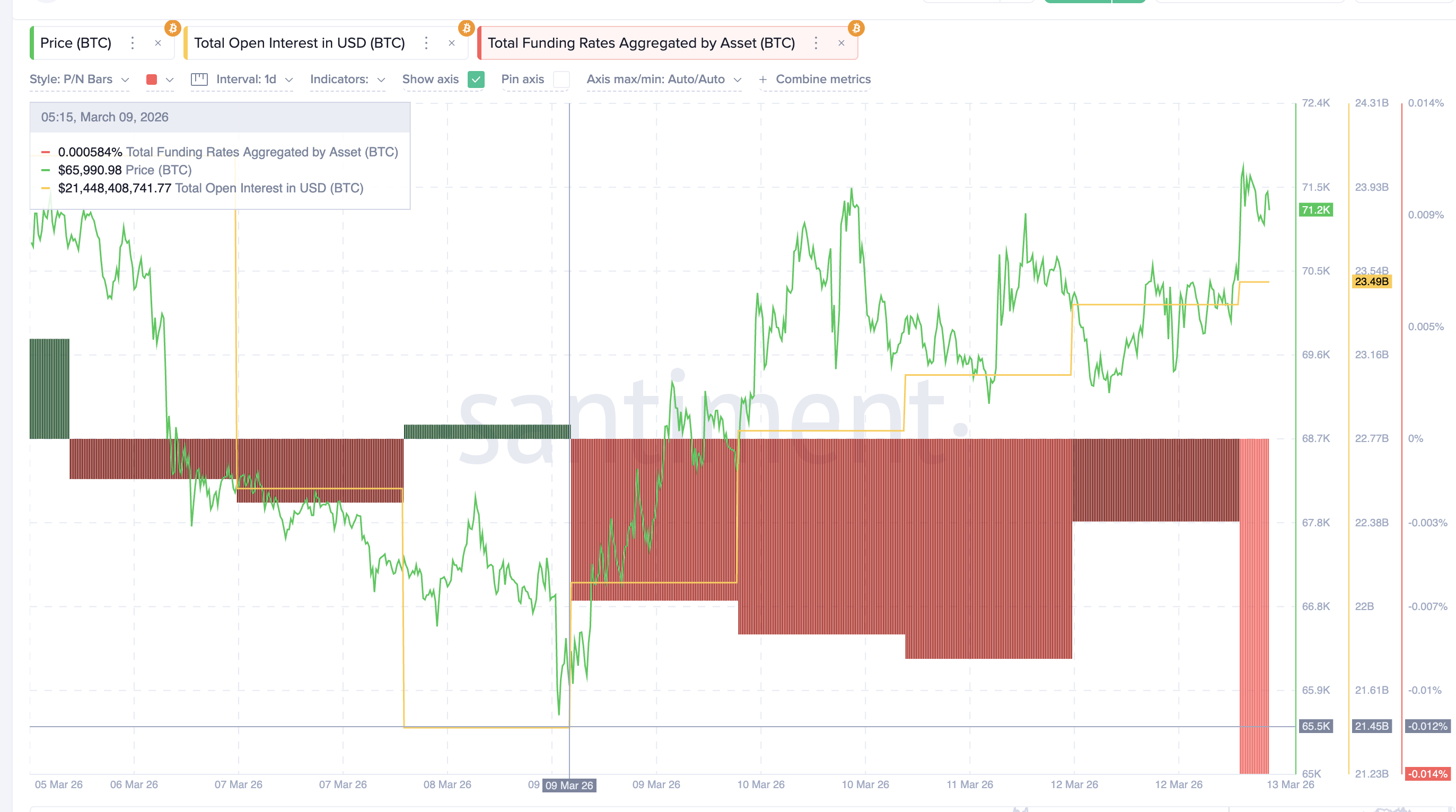 Open Interest, yang mencatat total nilai kontrak futures aktif, naik selama pergerakan harga tersebut. Pada 9 Maret, open interest Bitcoin berada di kisaran US$21,4 miliar. Sekarang sudah naik jadi sekitar US$23,49 miliar, berarti ada kenaikan hampir 10%.