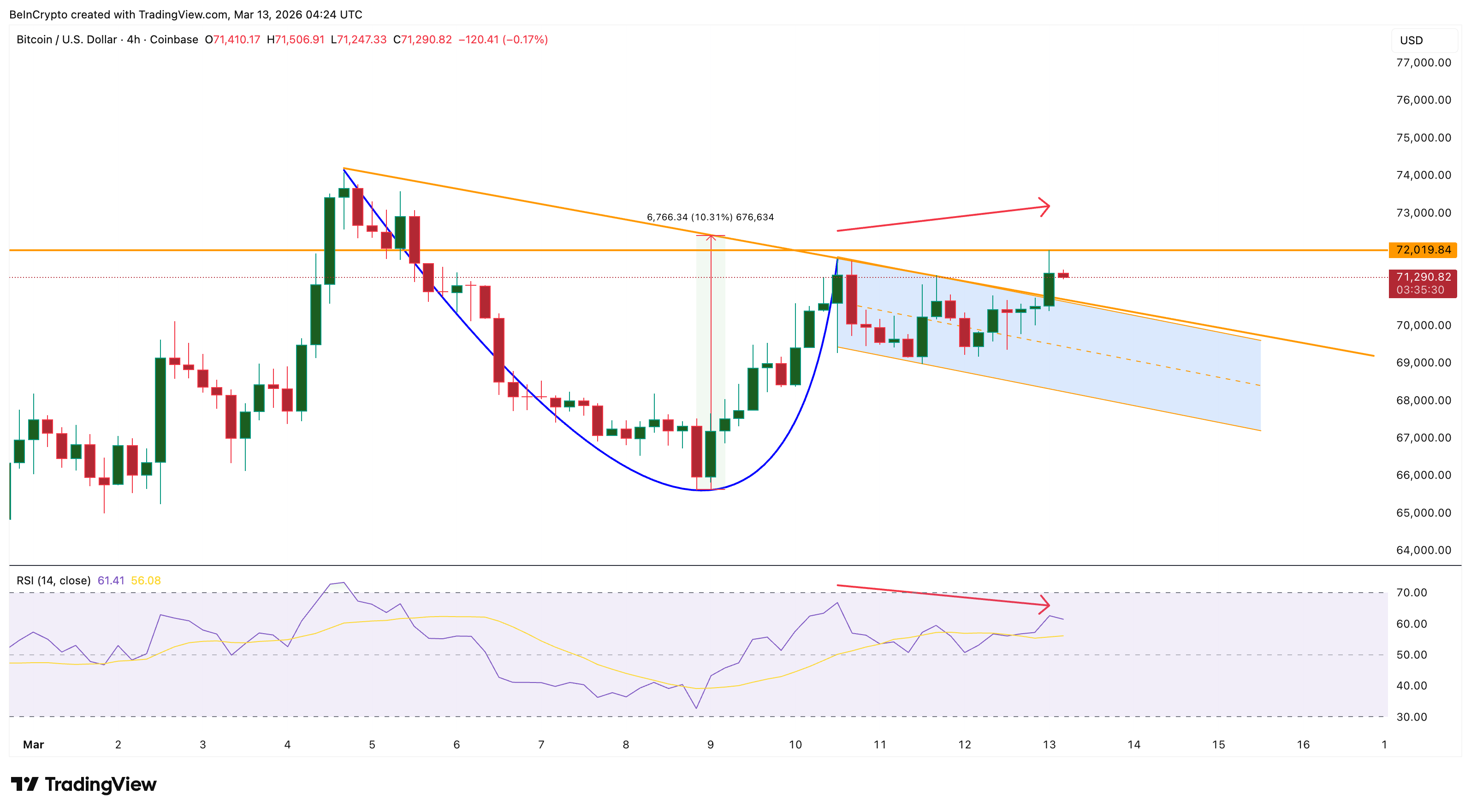 Jika harga Bitcoin mampu merebut kembali level US$72.000, divergensi Relative Strength Index kemungkinan akan melemah, dan struktur breakout bisa kembali mendapat momentum.