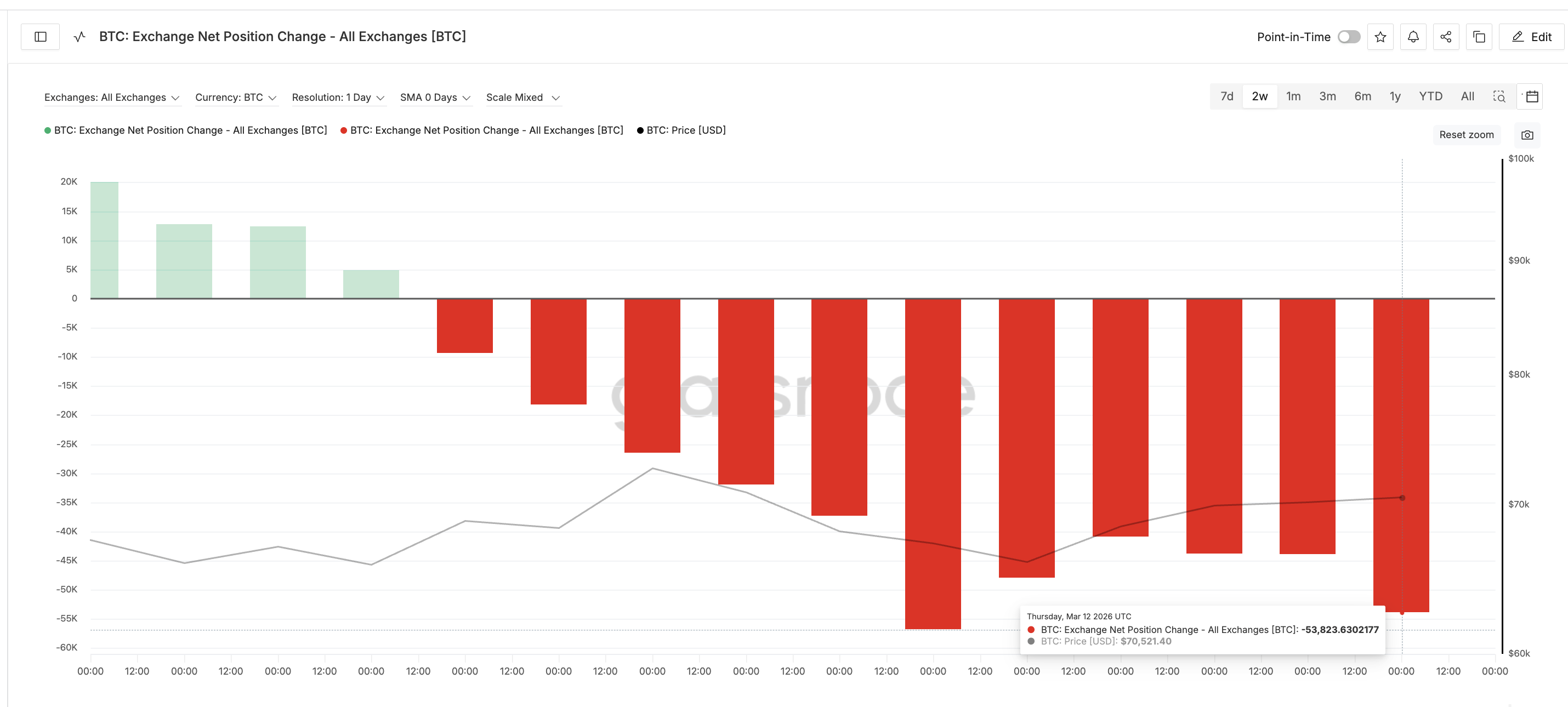 Metrik Exchange Net Position Change melacak berapa banyak koin yang masuk atau keluar exchange. Ketika metrik ini makin negatif, itu artinya investor menarik Bitcoin dari exchange, biasanya mengindikasikan tekanan jual yang menurun.