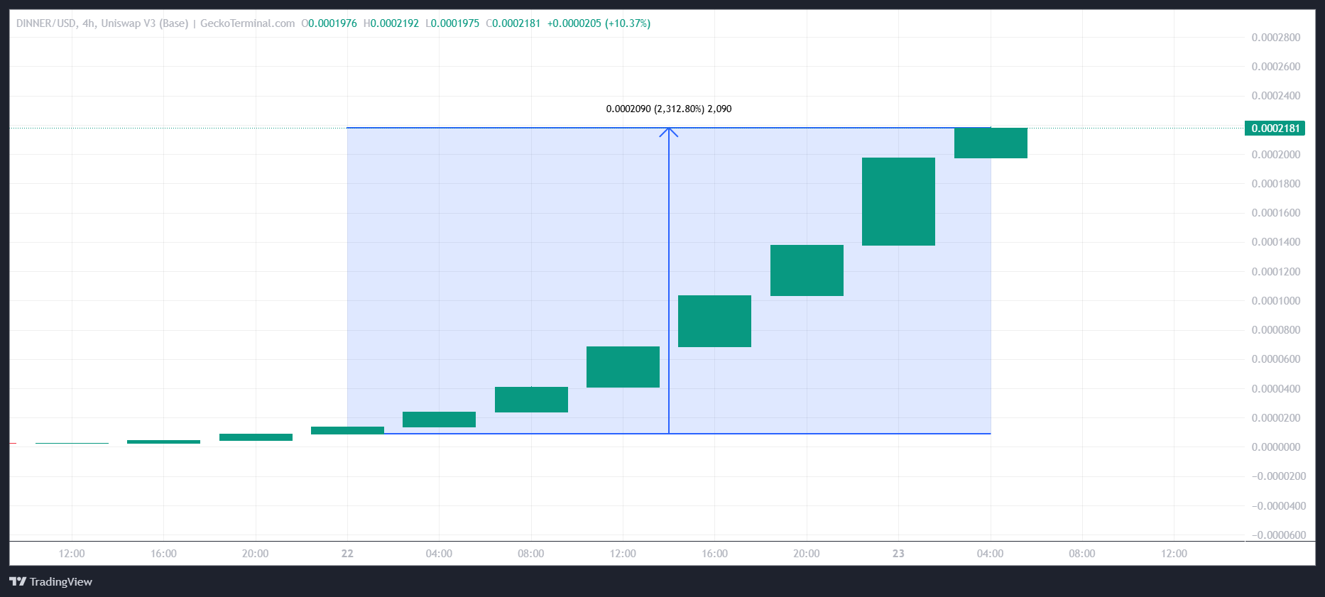 Meskipun acara makan malam gagal menghasilkan pergerakan signifikan dalam meme coin TRUMP, acara ini memicu kenaikan tak terduga pada token lain, Trump Dinner (DINNER). Dibuat hanya dua hari sebelum acara, DINNER melonjak sebesar 2.312%, naik dari US$0,0000139 menjadi US$0,0002186 dalam 24 jam.