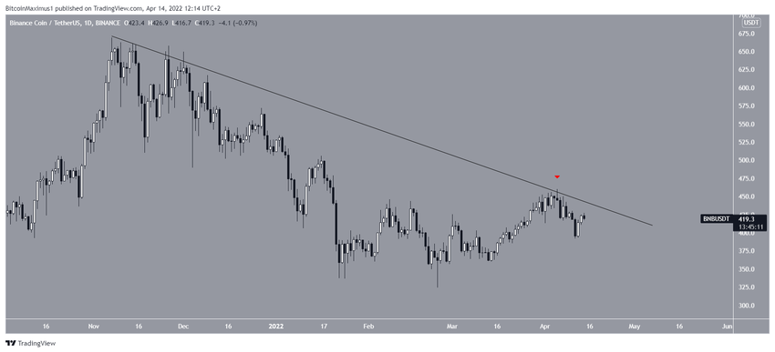 Binance Coin (BNB) telah bergerak turun sepanjang garis descending resistance yang tercipta sejak 7 November. Baru-baru ini, garis tersebut menimbulkan rejection saat 5 April. Ini adalah rejection kelima yang terjadi pada garis tersebut.