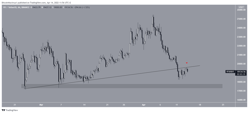 Akan tetapi, harga YFI terus mengalami penurunan setelahnya dan menjebol garis ascending support ketika 11 April. Saat ini, YFI sedang dalam proses memvalidasi garis tersebut sebagai resistance (lihat simbol warna merah).