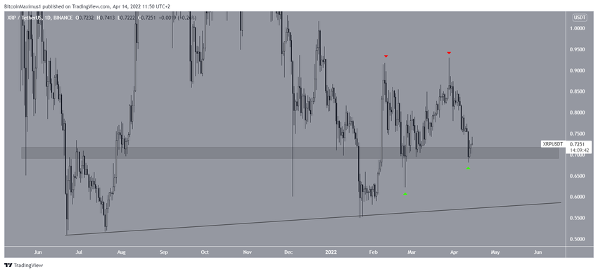 Tanggal 11 April kemarin, harga XRP melompat ke area horizontal di titik US$0,7 (lihat simbol hijau pada gambar). Sebelumnya, XRP juga pernah melompat ke area yang sama saat awal bulan Maret. Area ini adalah level krusial, sebab telah bertindak sebagai support dan resistance secara intermiten sejak Mei 2021.