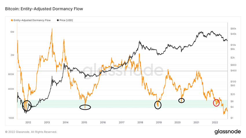 Kemudian, menyusul pergerakan tersebut, nilai aliran Adjusted Dormancy juga mencapai titik all-time low sebesar 126.000 pada bulan Juni. Jadi, meskipun ini termasuk nilai yang sangat oversold, fakta bahwa titik itu belum pernah tercapai sebelumnya dan di bawah batas bawah yang seharusnya ada di level 200.000 (kotak hijau) menempatkan indikator tersebut pada kategori kondisi yang belum pernah terjadi sebelumnya.