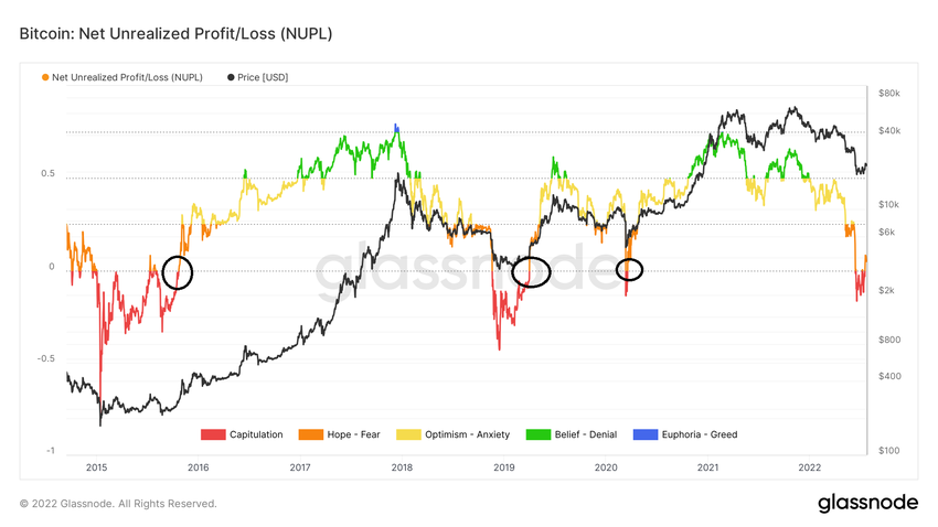 Titik terendah tahun 2018 tercapai 24 hari setelah NUPL masuk ke wilayah negatif, sedangkan untuk titik terendah tahun 2015 tercapai setelah 19 hari. Level terendah saat ini tercapai hanya 5 hari setelah NUPL memasuki zona negatif. Akibatnya, aksi pergerakan ini lebih mirip dengan titik bottom lokal yang terjadi di bulan Maret 2020.